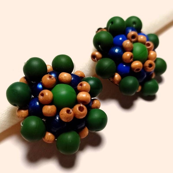 Vintage clusteroorclips met groene, blauwe en houten kralen in bloemvorm geregen uit de jaren '70-'80.