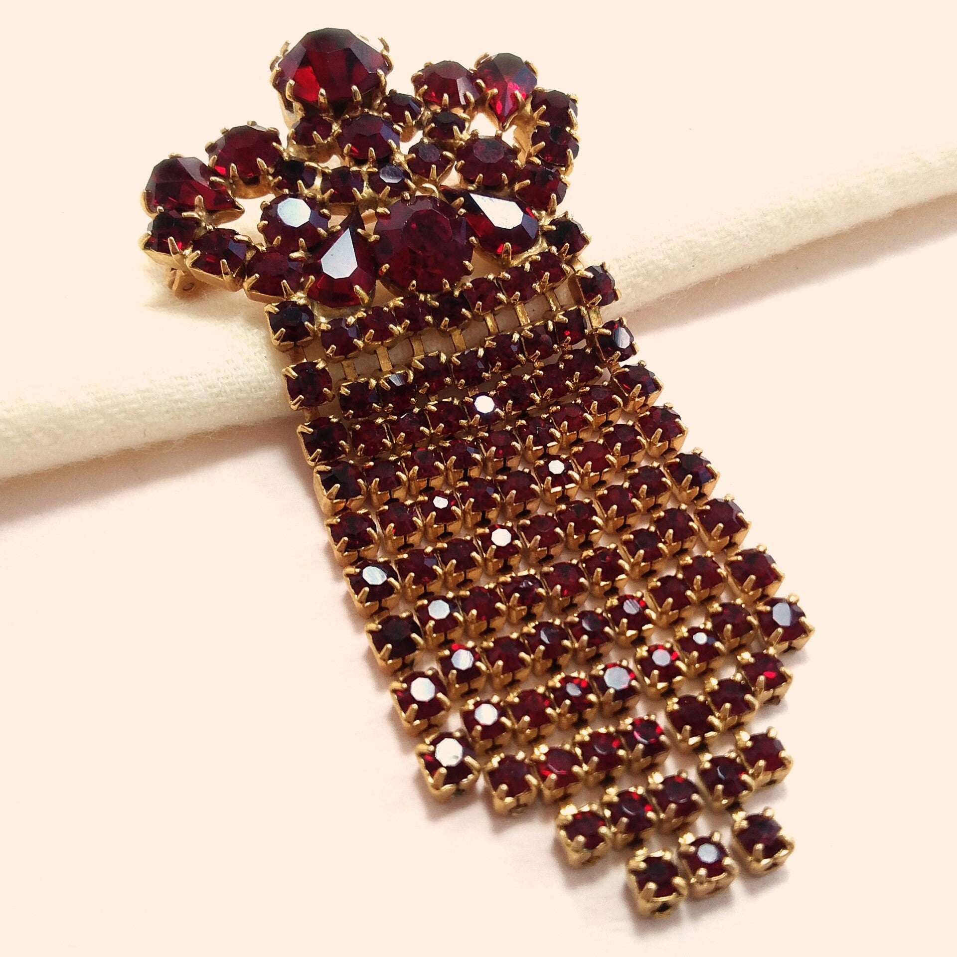 Vintage broche van goudkleurig metaal bezet met rode strass uit de late jaren '70-'80. Kleuren zijn in werkelijkheid iets lichter.