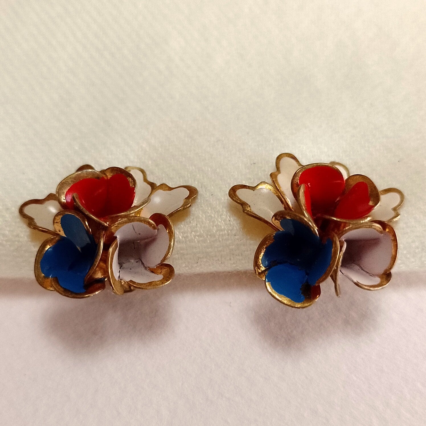 Vintage clipoorbellen in ontwerp van bloemetjes in rood, wit en blauw uit de jaren '40-'50.