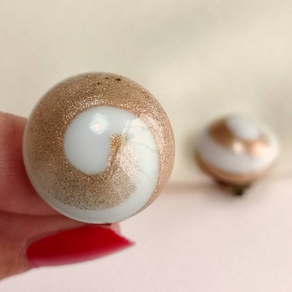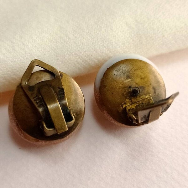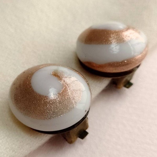 Vintage clipoorbellen met wit en goudbruine cabochon van muranoglas uit de jaren '50-'60. Gemerkt op de clip: 'Made Italy'.