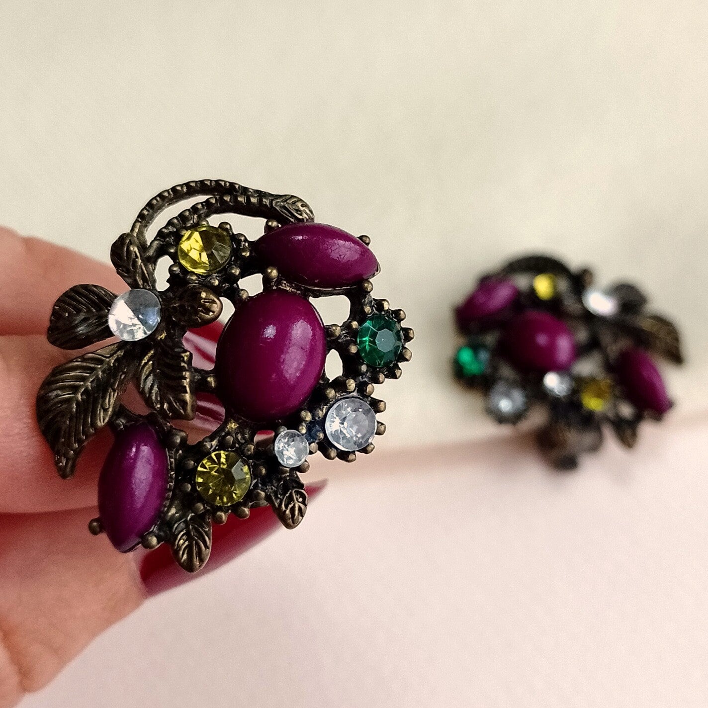 Vintage clipoorbellen van metaal met oud brons afwerking in floraal ontwerp en strass uit de jaren '90, of early 2000s.