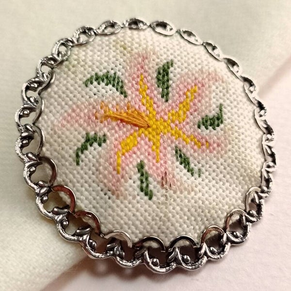 Vintage broche van geborduurde roze en gele bloem in zilverkleurige omlijsting uit de jaren '50-'60.