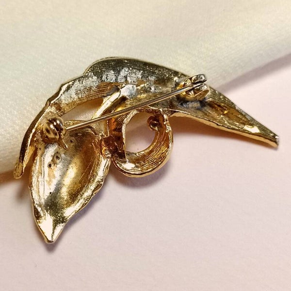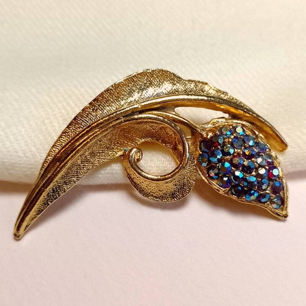 Vintage broche van verguld metaal met bloem of knop en blad bezet met rode aurora borealis strass uit de jaren '50-'60.