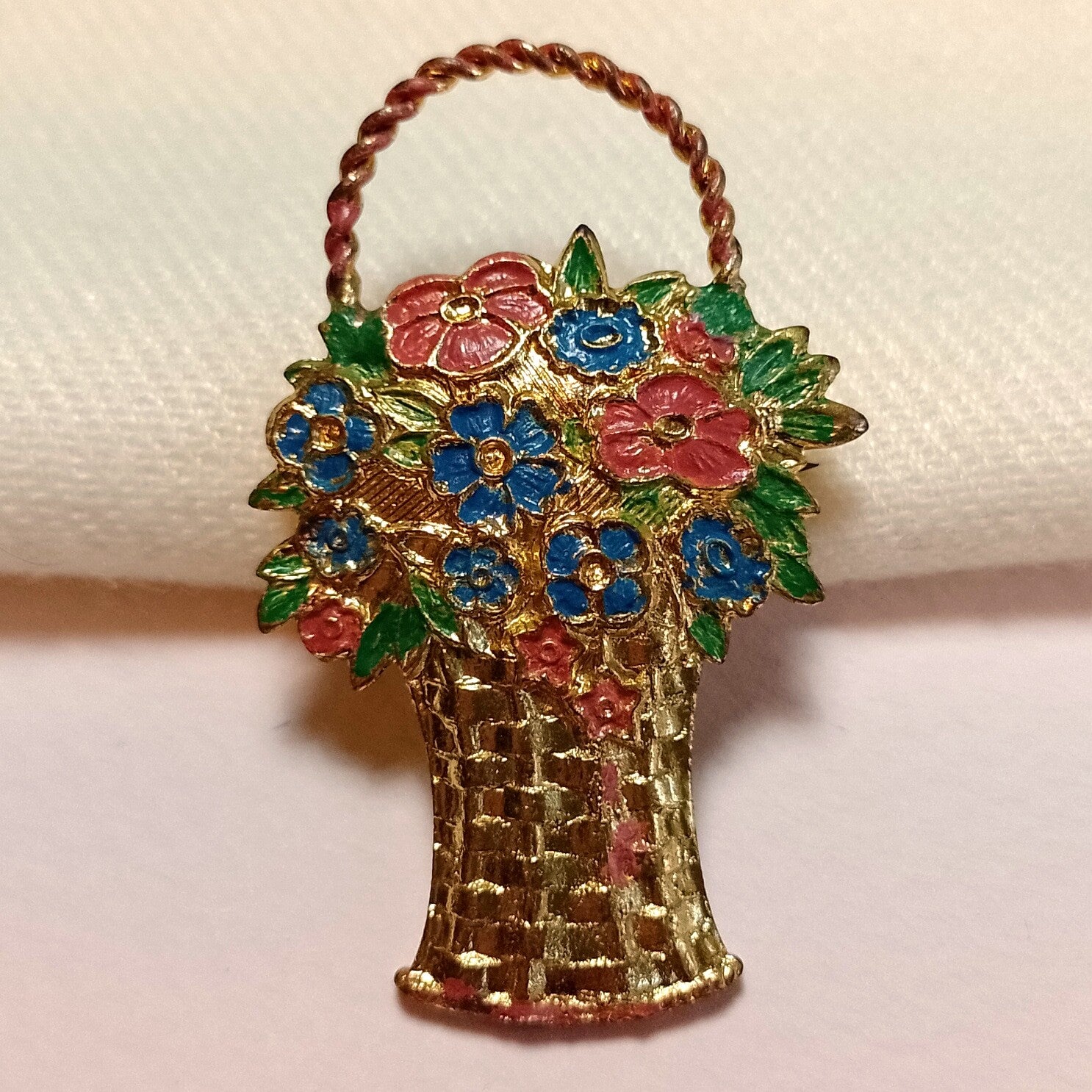 Vintage broche in ontwerp van een gouden bloemenmand met blauwe en roze bloemen uit de jaren '50.