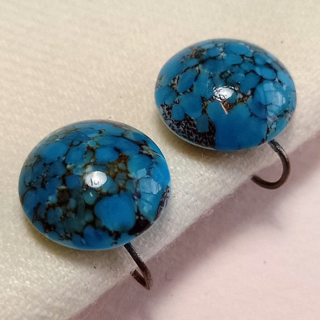 Vintage schroefoorbellen met glazen blauw gemarmerde cabochon uit de jaren '60.