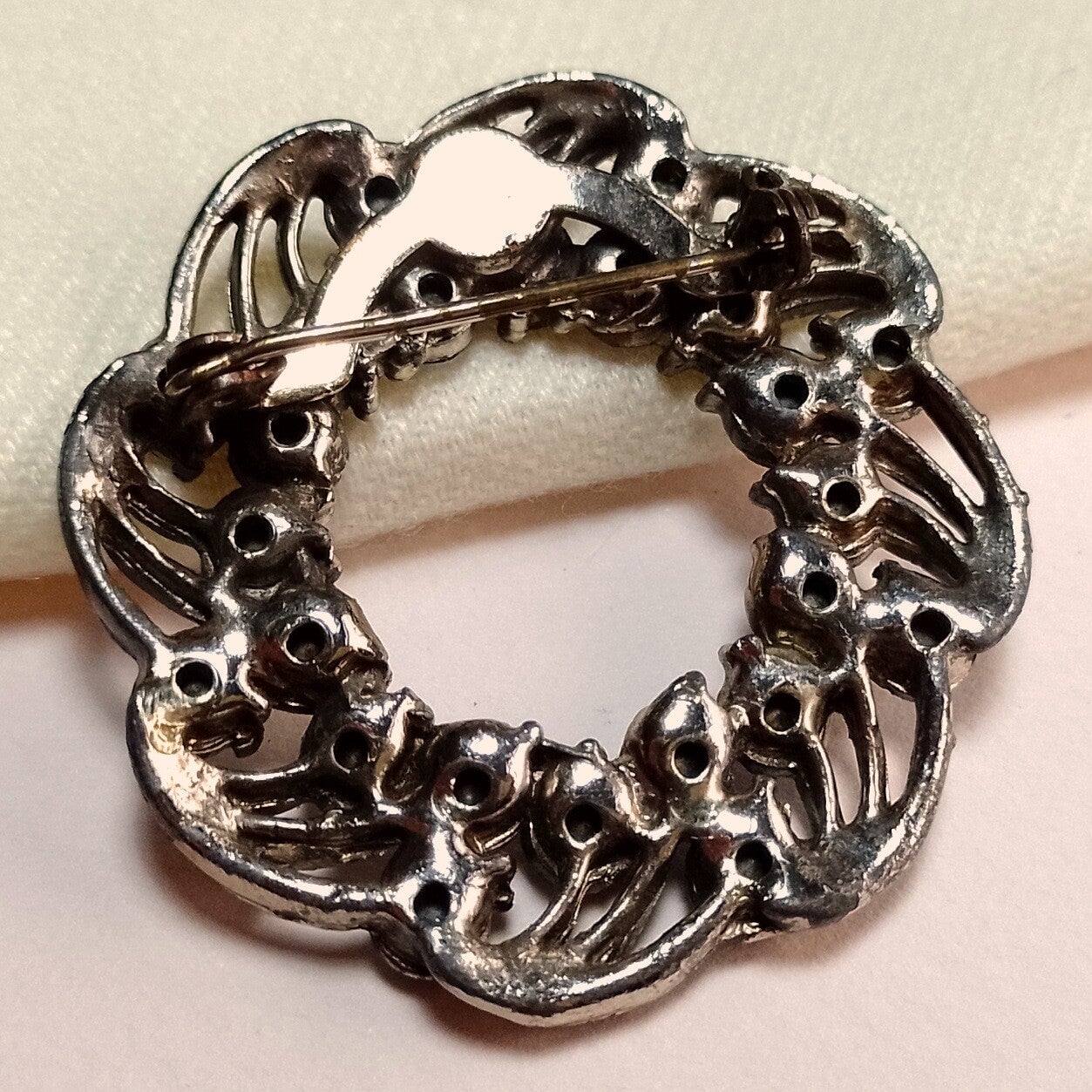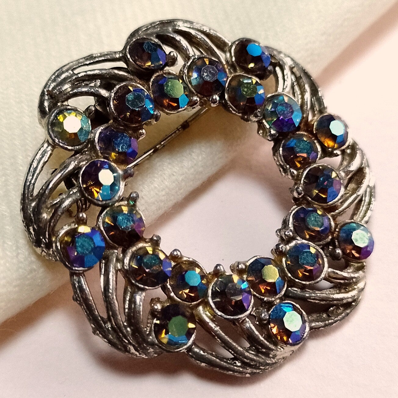Vintage broche in ontwerp van een krans bezet met blauwe aurora borealis strass uit de jaren '50-'60.