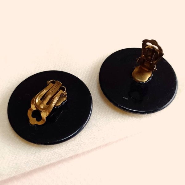 Vintage oorclips in rond ontwerp met cremewitte, zilveren en gouden print op zwarte achtergrond uit de jaren '80.