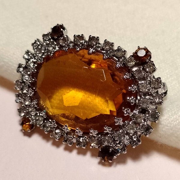 Vintage broche van zilverkleurig metaal bezet met honingkleurige en heldere strass uit de jaren '80.