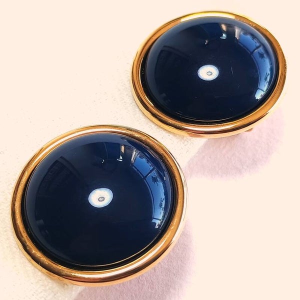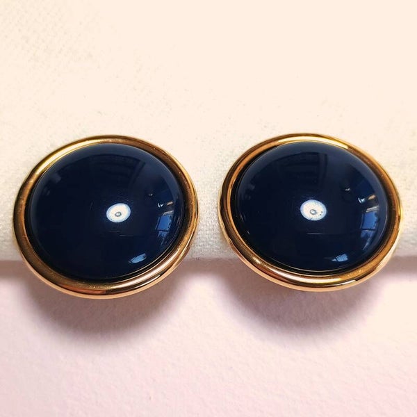 Gesigneerde vintage oorclips van Monet van verguld metaal en blauw kunststof cabochon uit de jaren '70-'90. Gemerkt op de clip: 'Monet ©'.