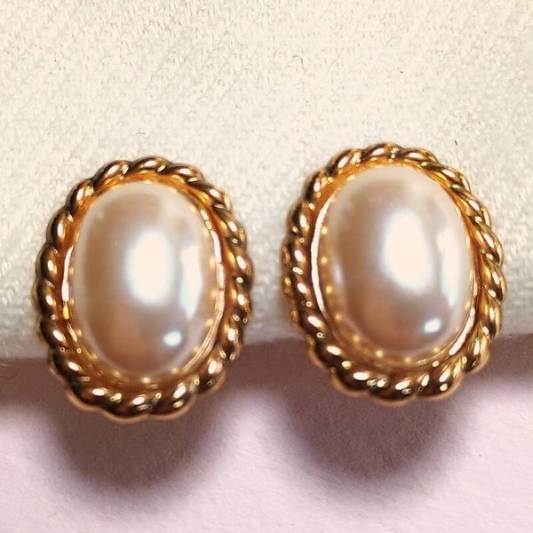 Vintage oorclips met faux parel cabochon in vergulde omlijsting uit de jaren '80-'90
