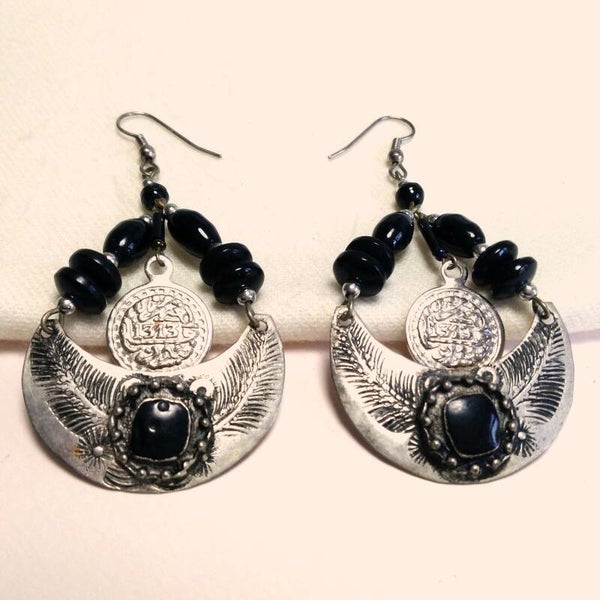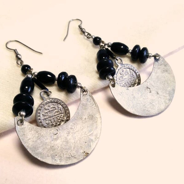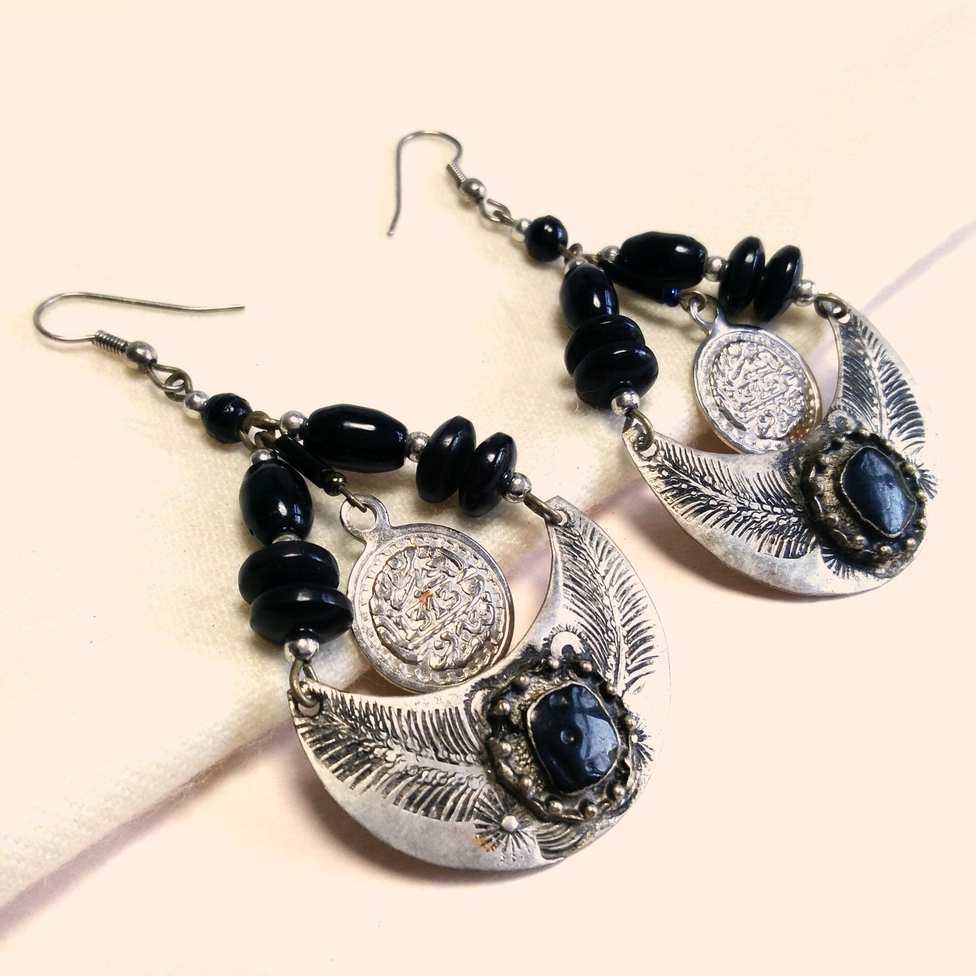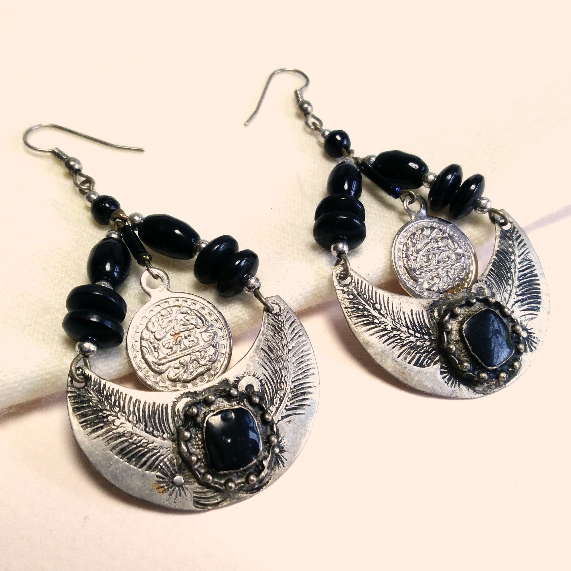 Old stock vintage oorbellen van Indisch zilver en metalen muntje. Zwart emaille in het hart en zwart glazen kalen, uit eind jaren '70-begin jaren '80.