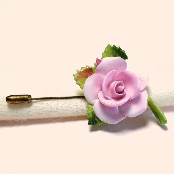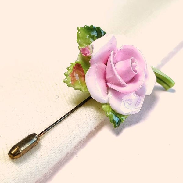 Vintage hoeden- of reversspeld met porseleinen roze roos op drie groene blaadjes en steel uit de jaren '50-'60.