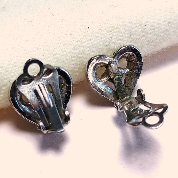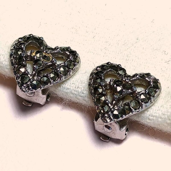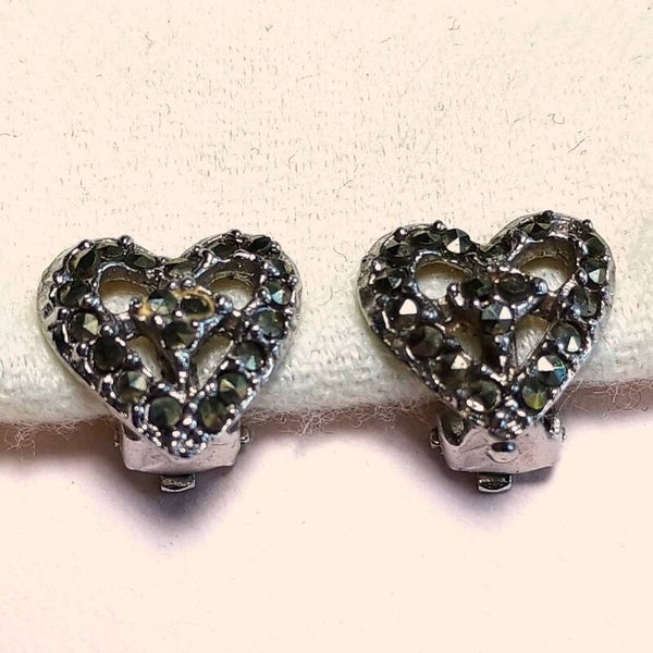 Vintage clipoorbellen in hartjesvorm met marcasiet steentjes uit de jaren '40-'60.