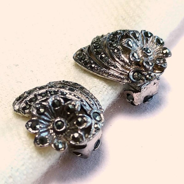 Vintage oorclips van zilverkleurig metaal in bloemontwerp met marcasiet steentjes uit de jaren '40-'60.