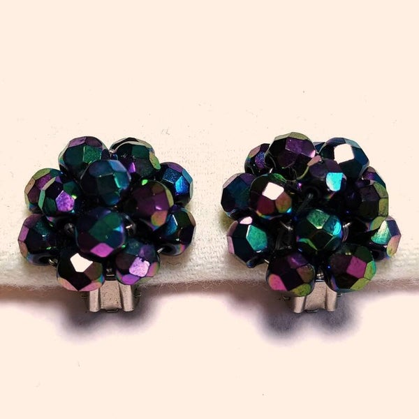 Vintage clipoorbellen met zwarte aurora borealis kralen in cluster geregen uit de jaren '50-'60, of 80s does 50s.