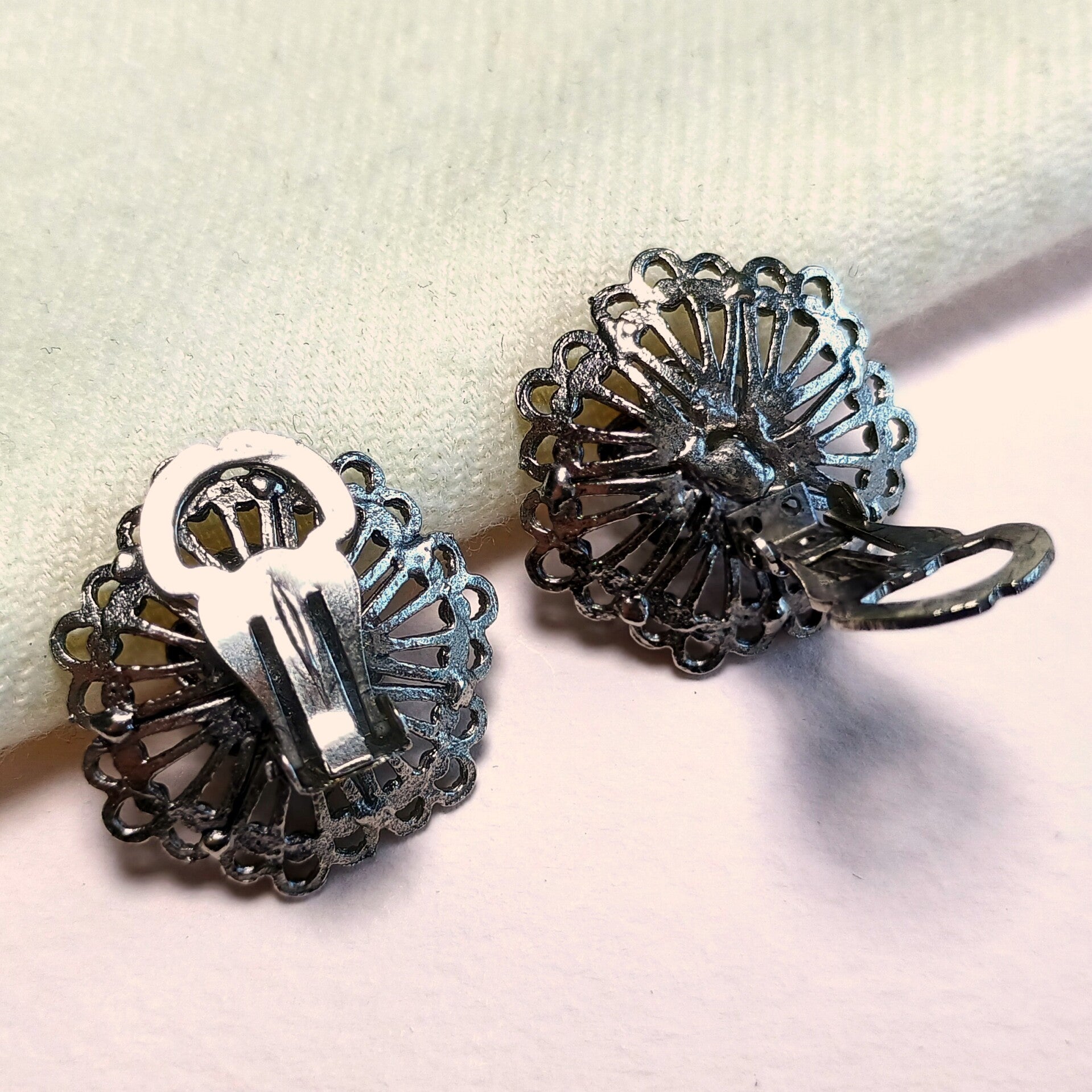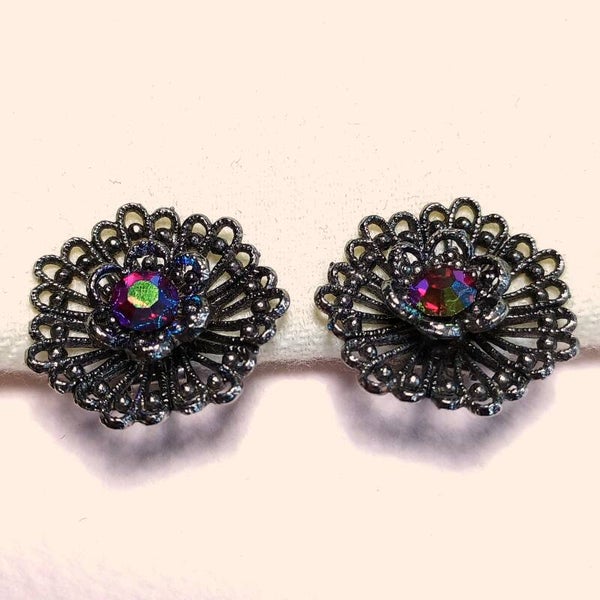 Vintage oorclips van zilverkleurig metaal met rode aurora borealis strass uit de jaren '70-'80.