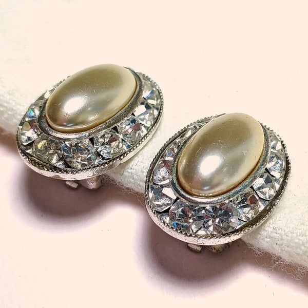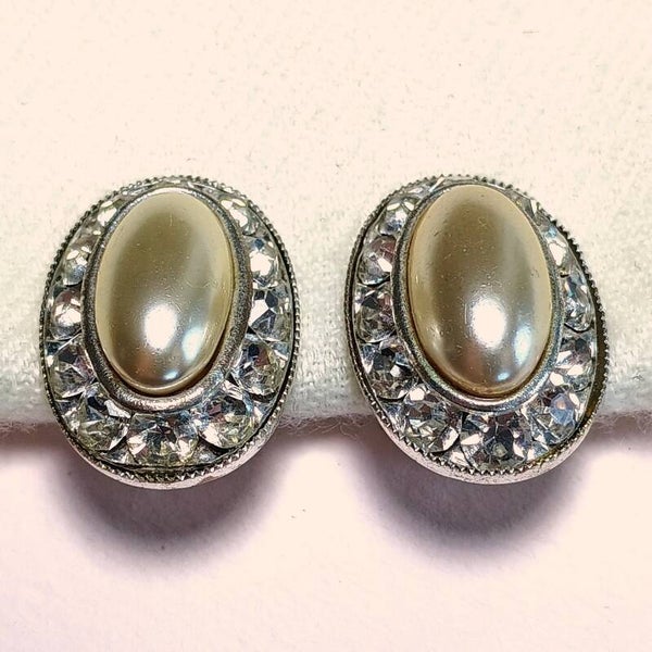 Vintage clipoorbellen in ovale vorm met faux parel en heldere strass uit de jaren '80.