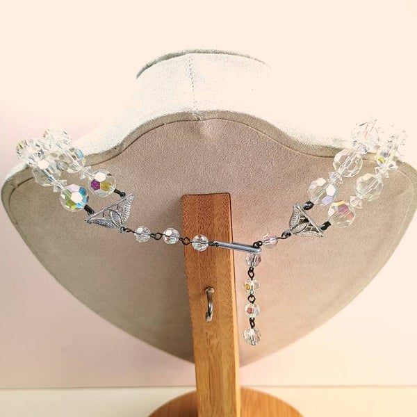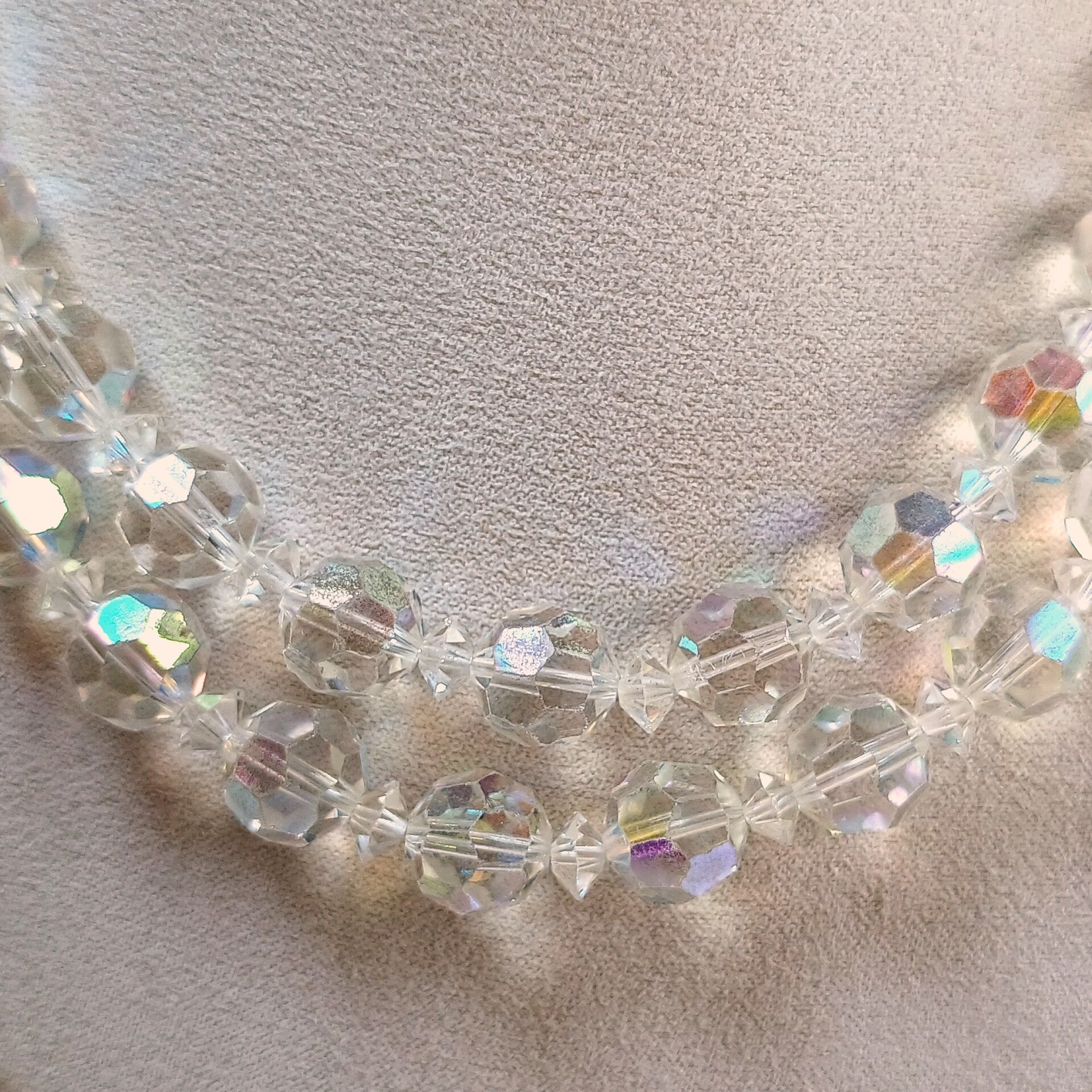 Vintage ketting met twee rijen facet geslepen aurora borealis kralen uit de jaren '60. Met verlengkettinkje.