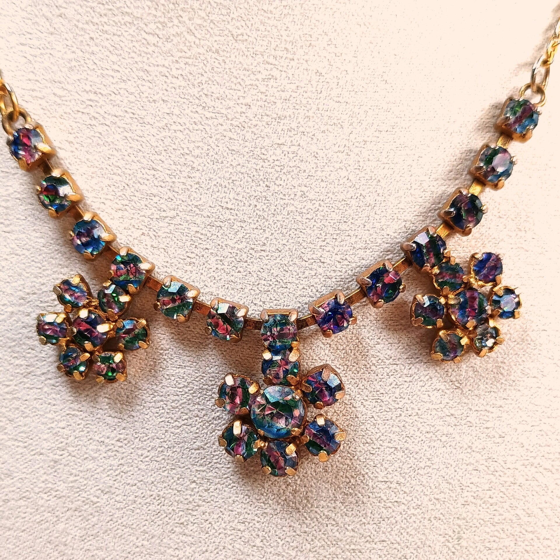 Vintage ketting met tricolore strass in drie bloemetjes gesoldeerd uit de jaren '50-'60.