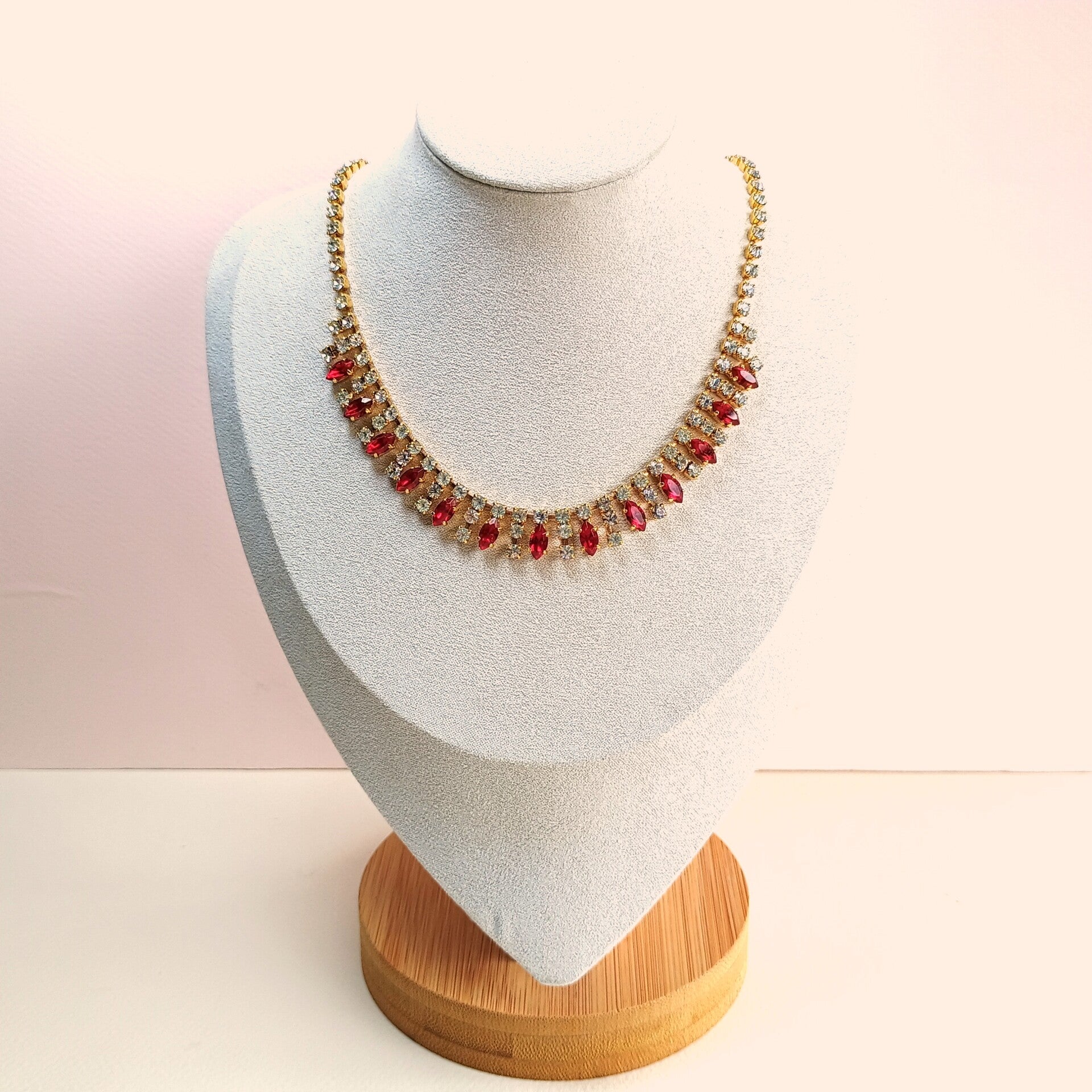 Vintage ketting van goudkleurig metaal bezet met rode en heldere strass uit de jaren '80-'90.