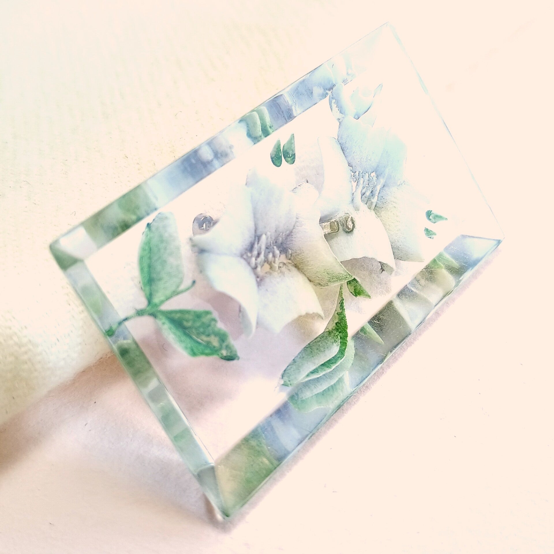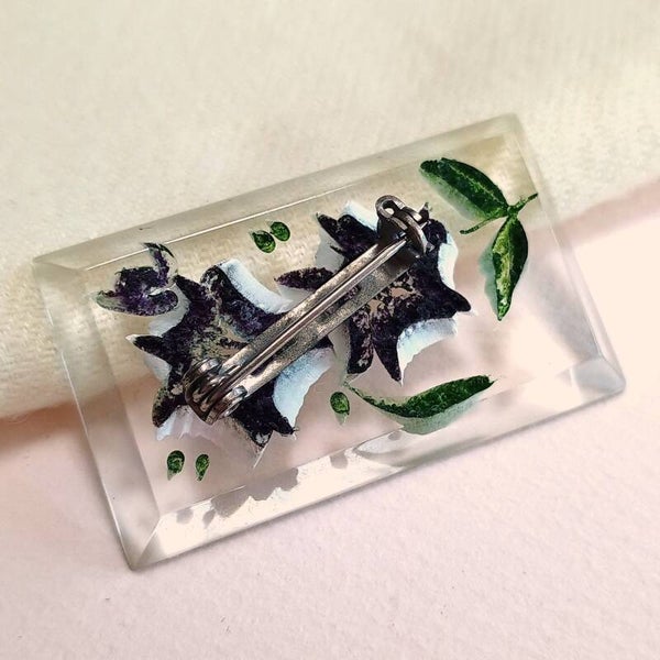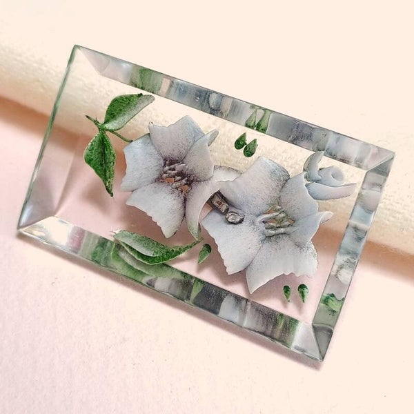 Vintage broche van reversed carved lucite met witte bloemen uit de jaren '30-'50.