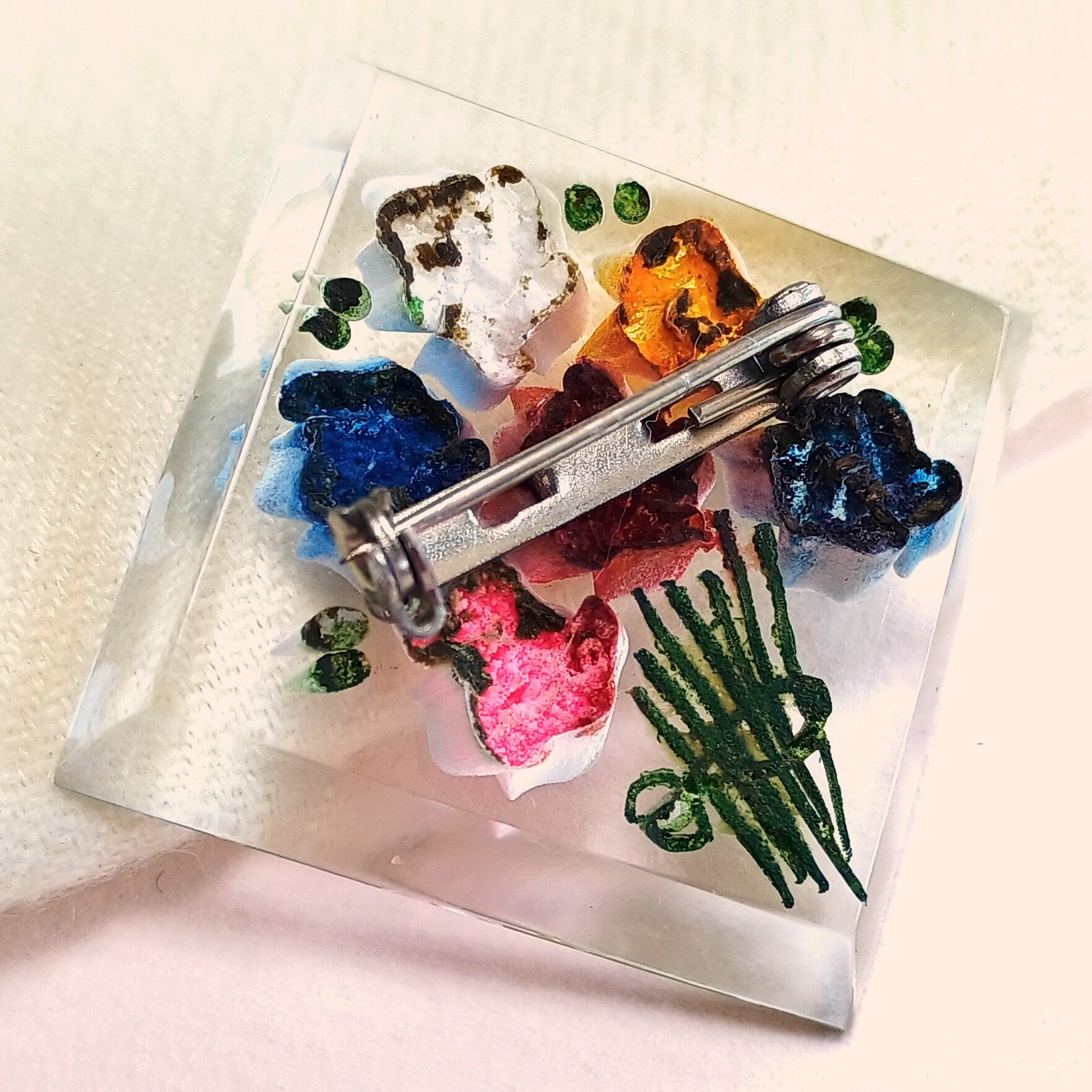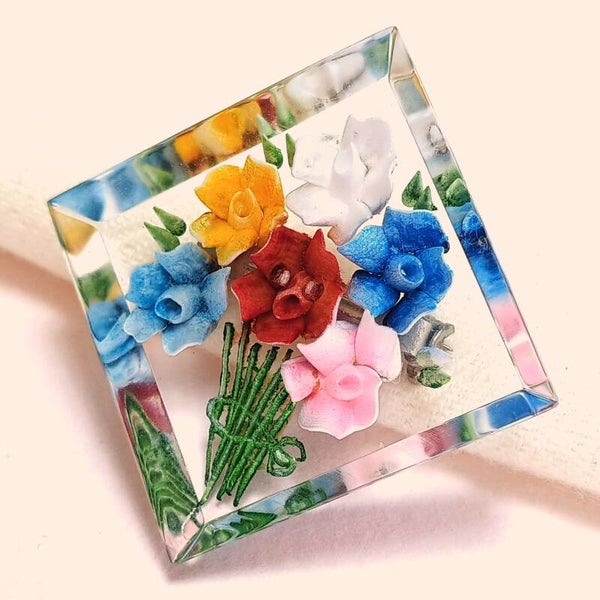 Vintage broche van reversed carved lucite met bonte bloemen boeket uit de jaren '30-'50.