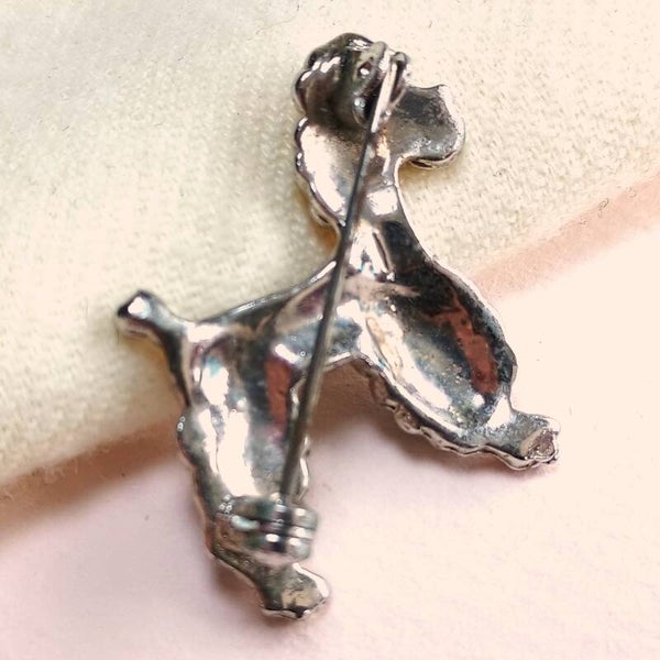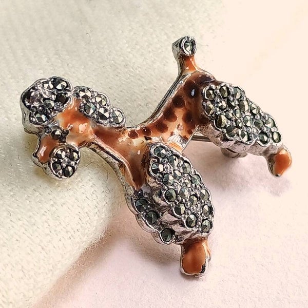 Vintage broche van zilverkleurig metaal met bruin emaille en marcasiet steentjes in ontwerp van een poedel uit de jaren '60.