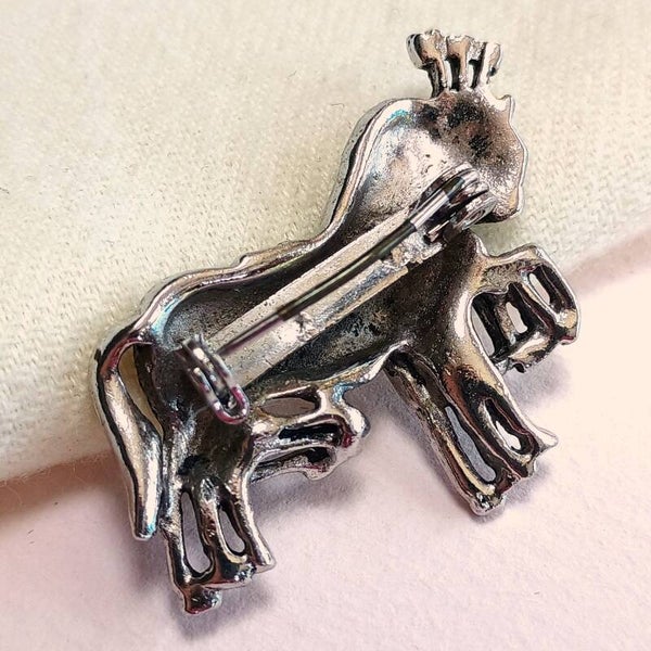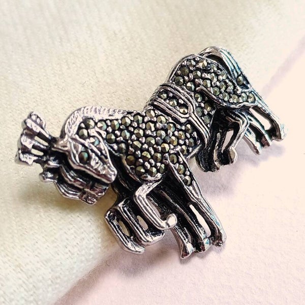 Vintage broche van zilverkleurig metaal rijkelijk bezet met marcasiet steentjes in ontwerp van drie achter elkaarstaande dressuurpaarden.