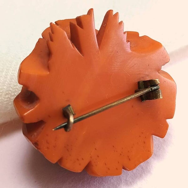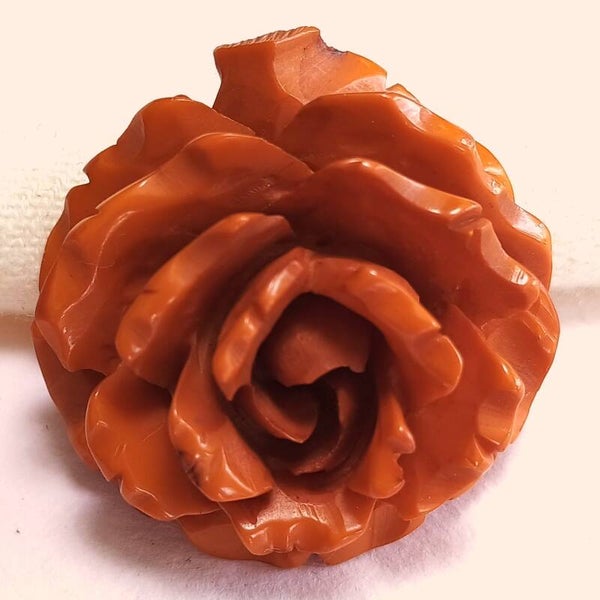 Vintage broche van cognackleurig kunststof in roos ontwerp uit de jaren '70.