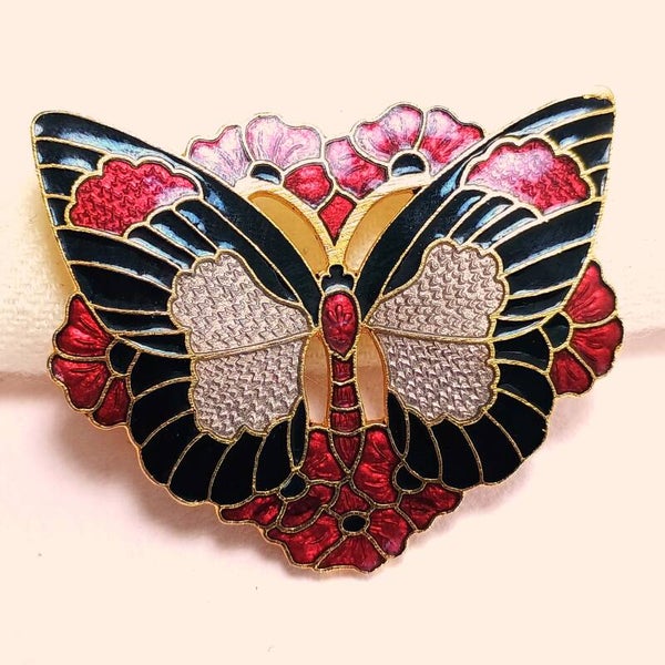 Gesigneerde vintage broche in email cloisonné techniek in ontwerp van een vlinder en bloemen uit de jaren '70-'80. Gemerkt op de achterkant: '© Fish'.