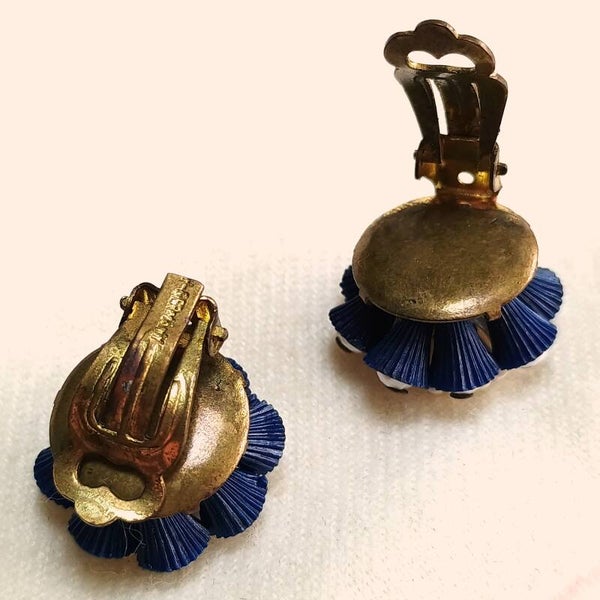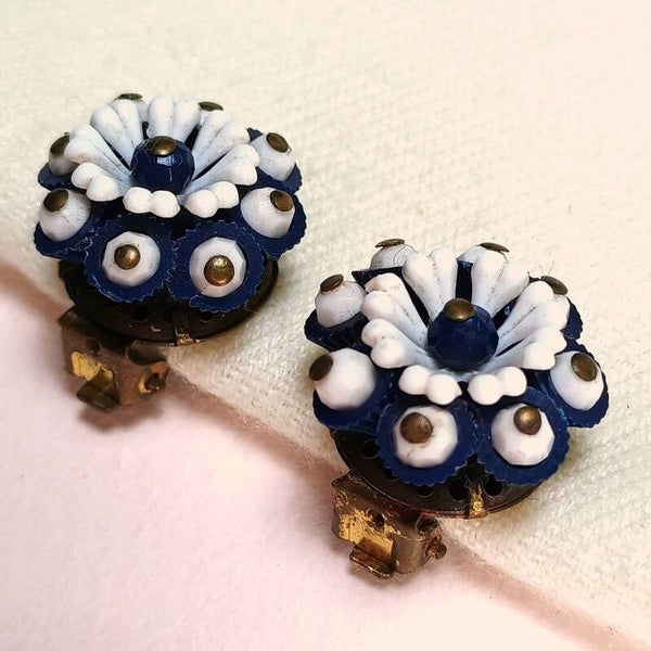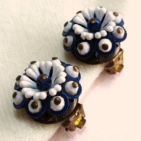 Vintage clipoorbellen van donkerblauw en wit kunststof in bloem ontwerp uit de jaren '40-'50.