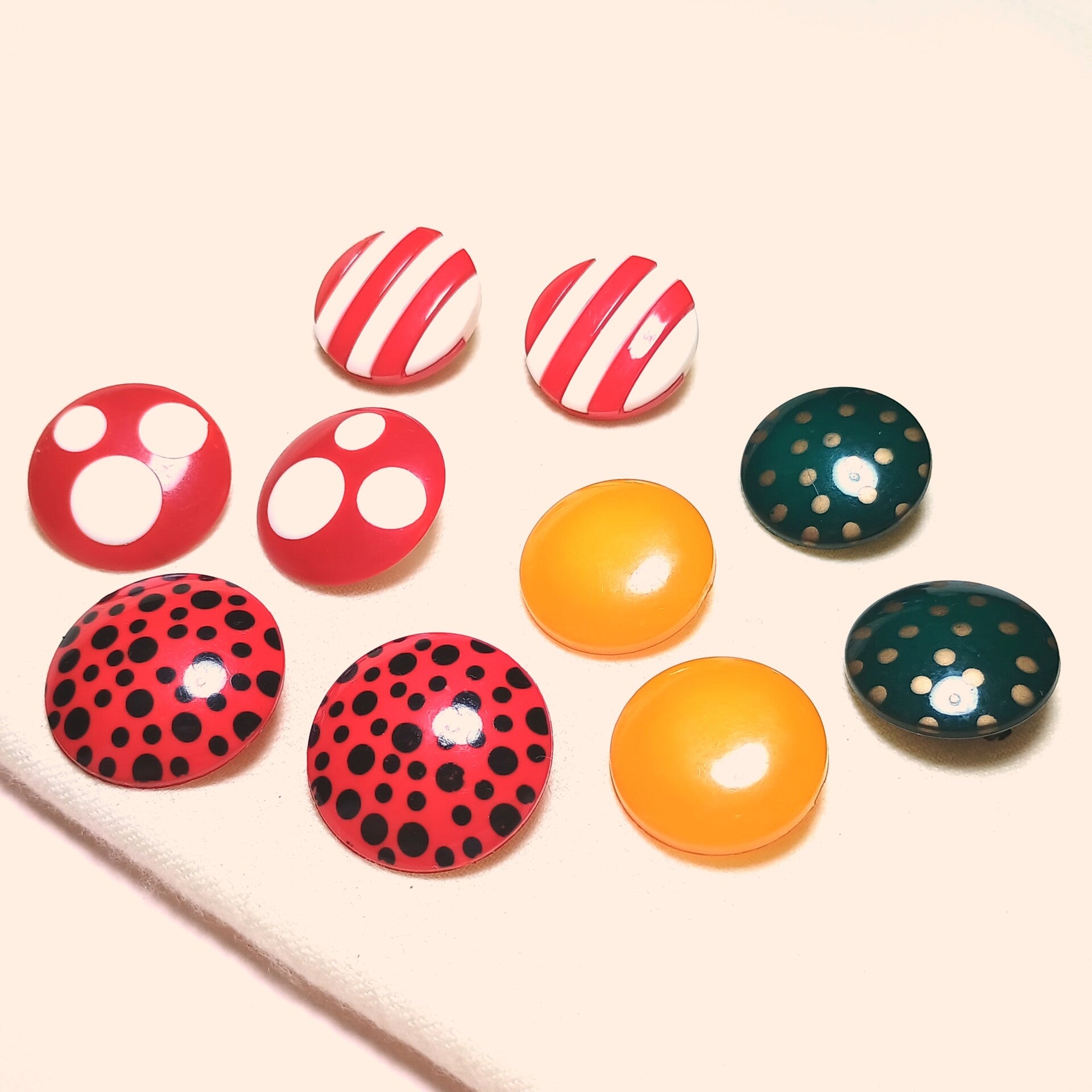 Vintage ronde clipoorbellen van kunststof in verschillende kleuren en dessins uit de jaren '80. Per paar te koop.