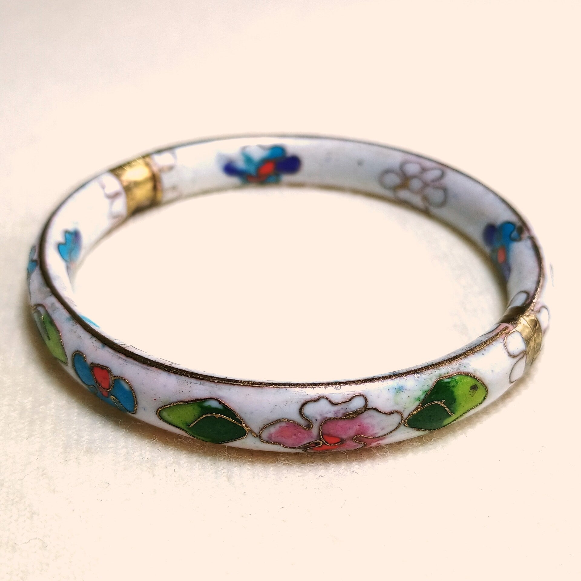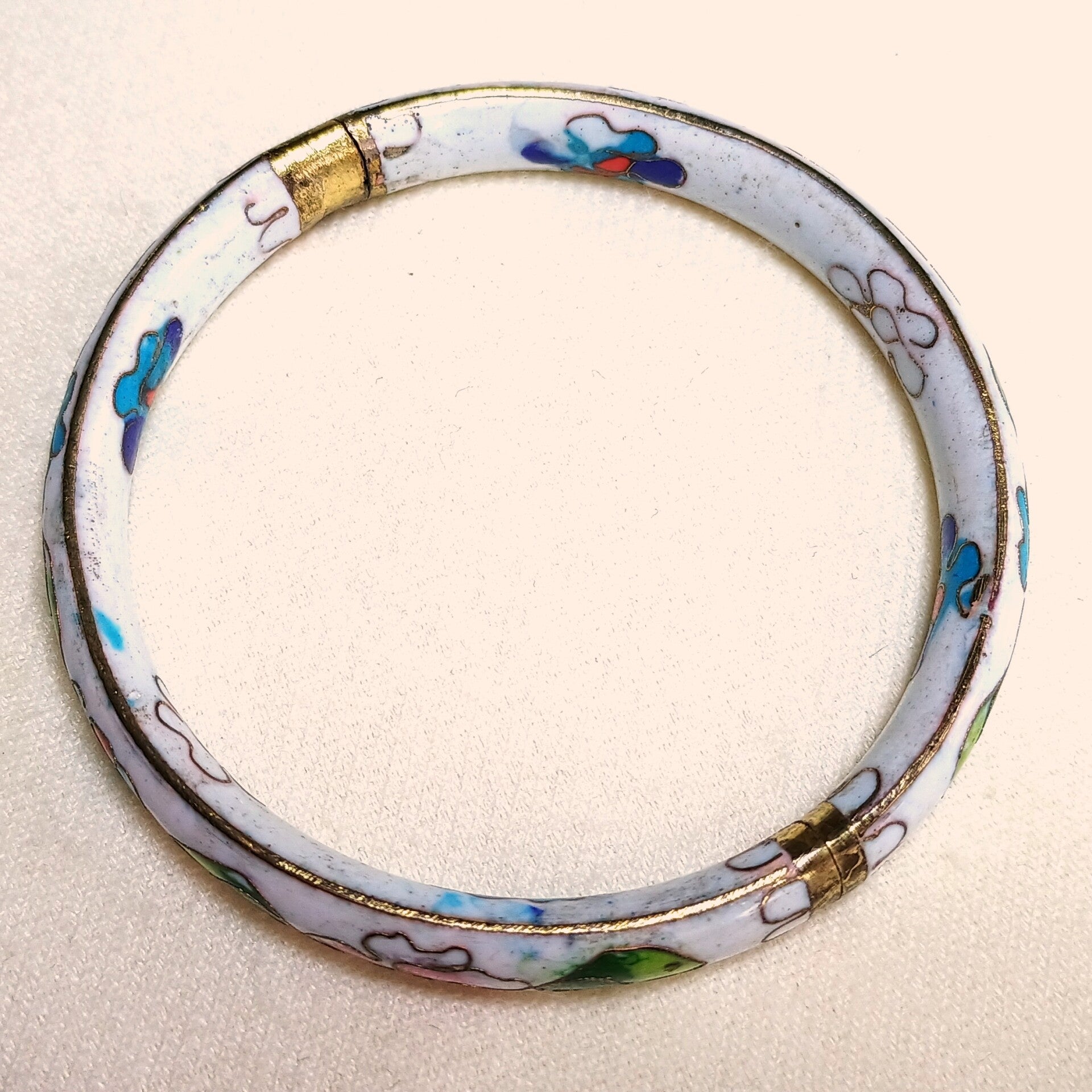 Vintage cloisonné armband met kliksluiting met decor van bloemen op witte achtergrond uit de jaren '70.