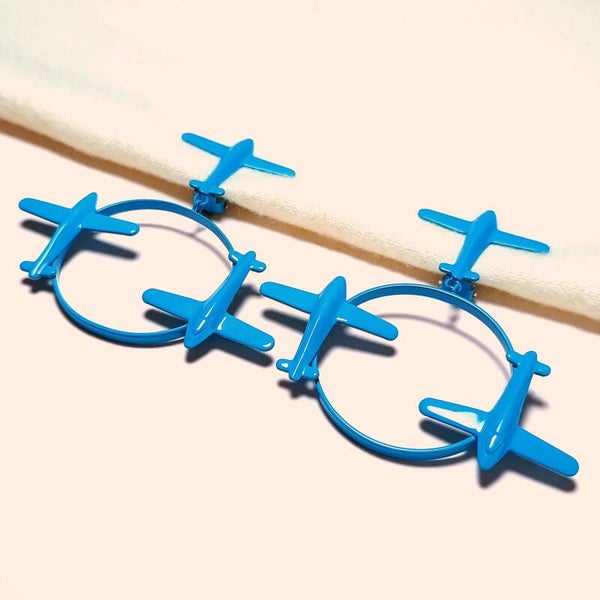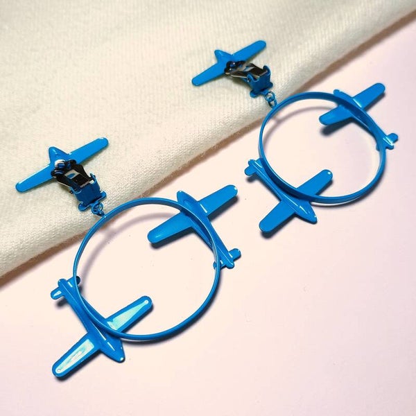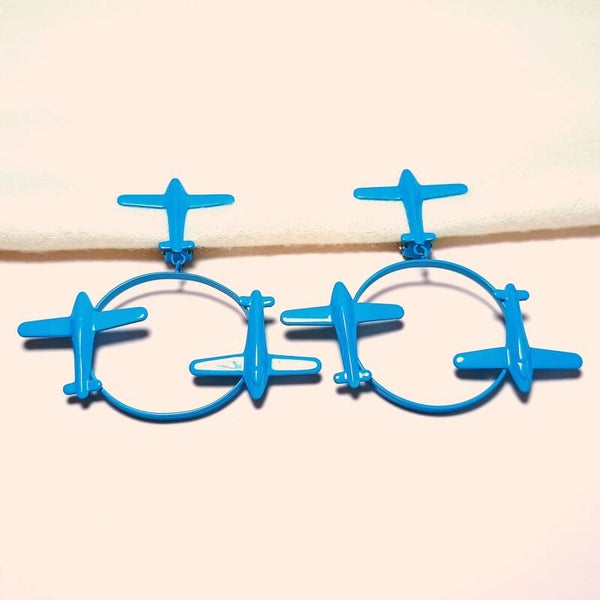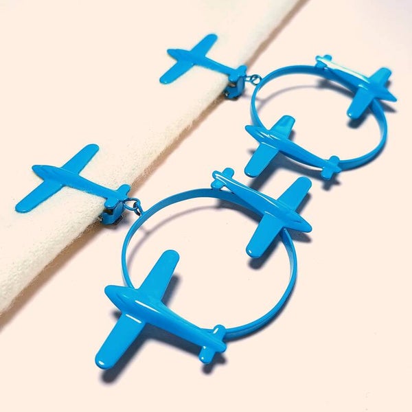 Vintage clipoorbellen in helder blauwe kleur met drie vliegtuigjes uit de jaren '80.