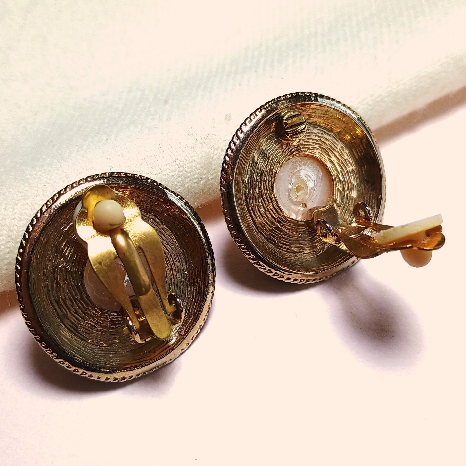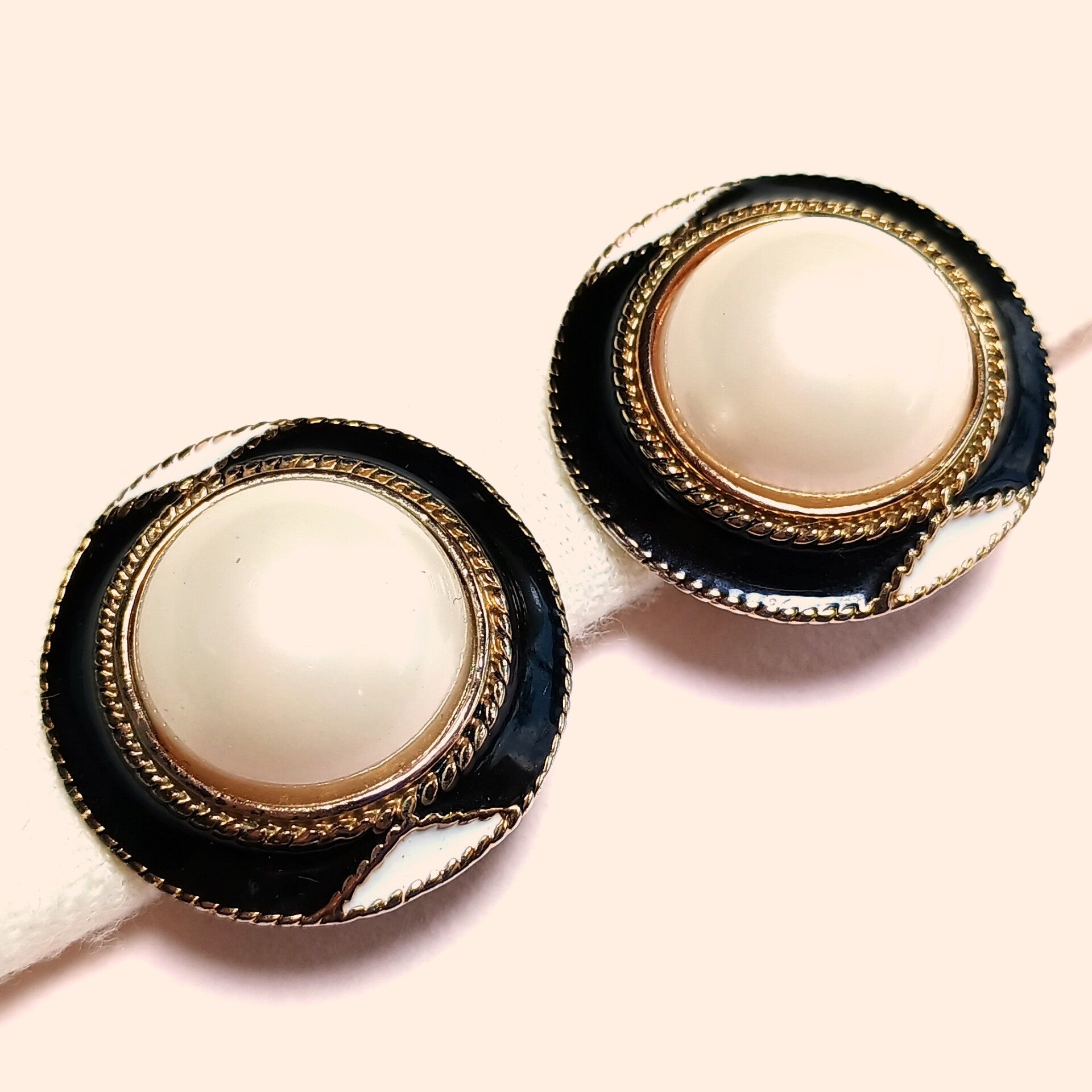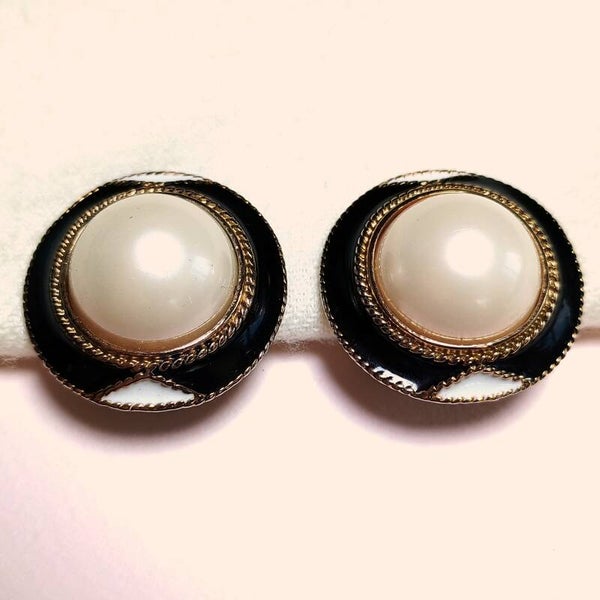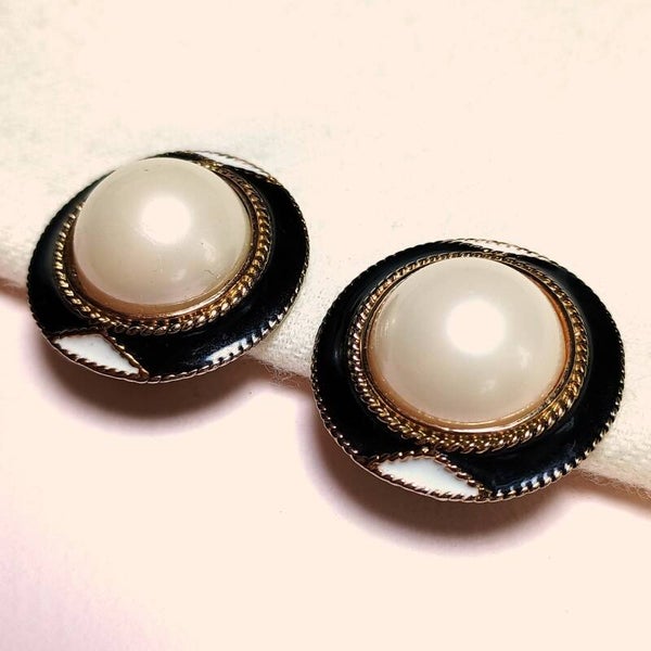 Vintage clipoorbellen van verguld metaal met zwart en wit emaille en faux parel cabochon uit de jaren '80.