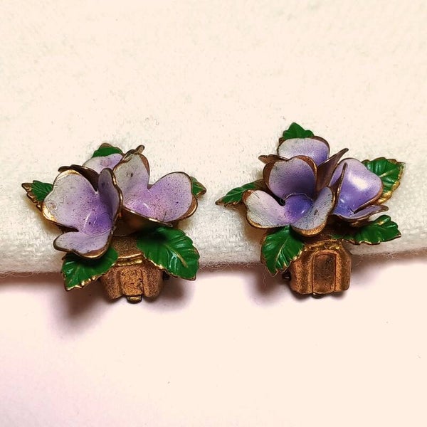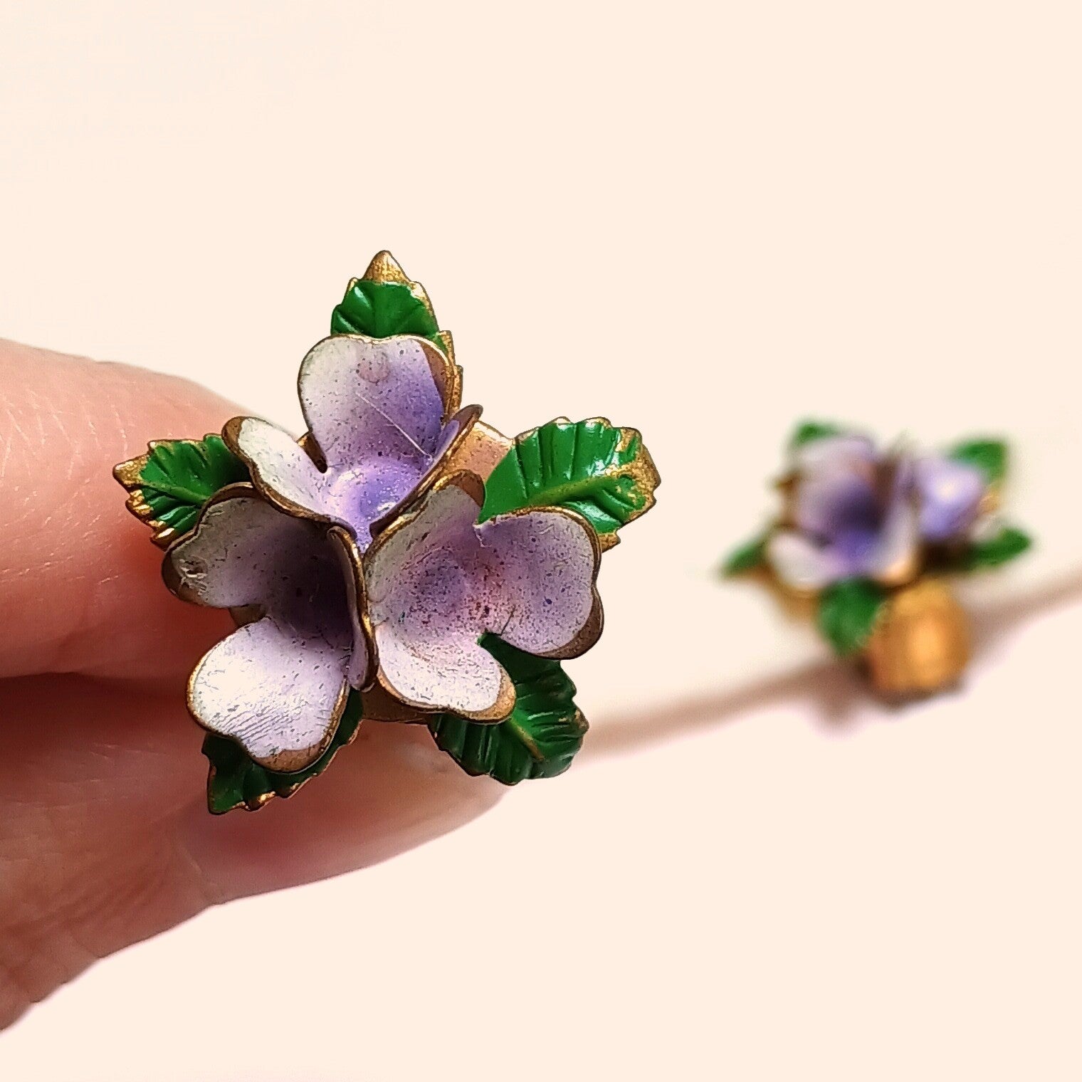 Vintage oorclips van beschilderd metaal in ontwerp van lila bloemen uit de jaren '40-'50.