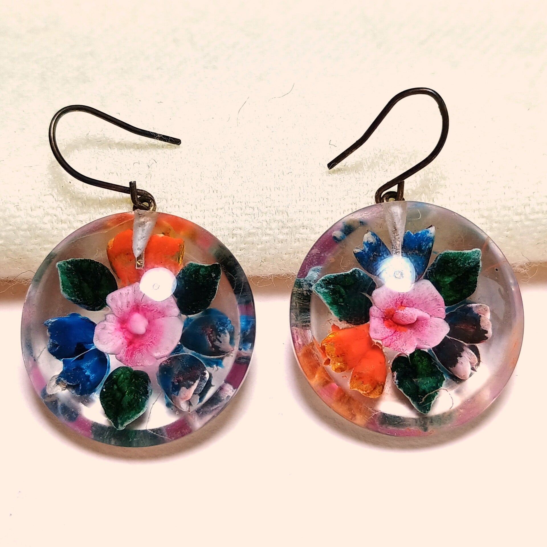 Vintage reversed carved lucite oorbellen met roze bloem en groene bladeren uit de jaren '40-'50.