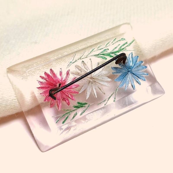 Vintage broche van reversed carved lucite met rode, witte en blauwe bloem uit de jaren '40-'50.