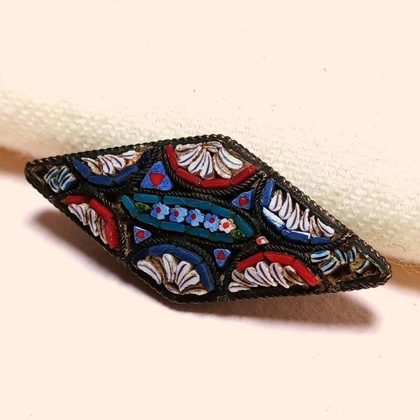 Italiaanse vintage micromozaïek broche met glazen stukjes in decoratief ruitvormig ontwerp uit de jaren '30.