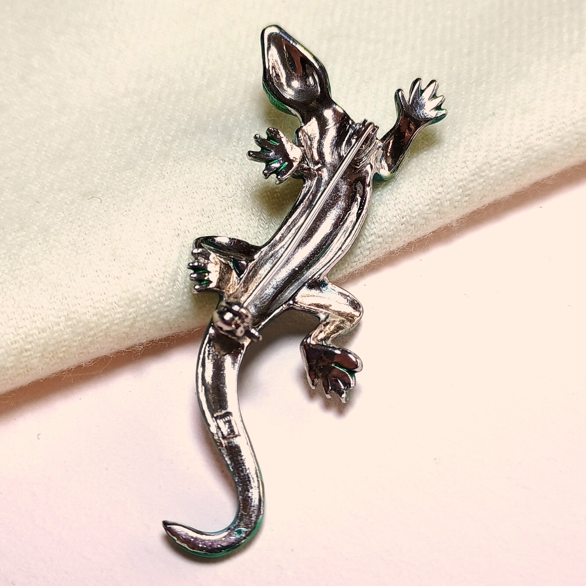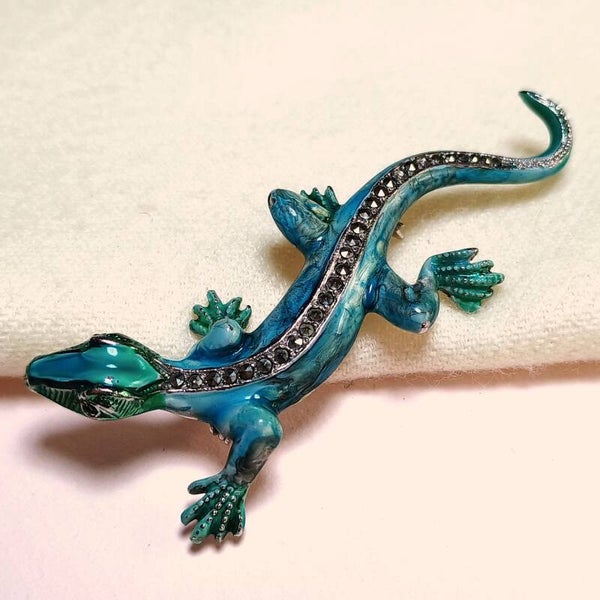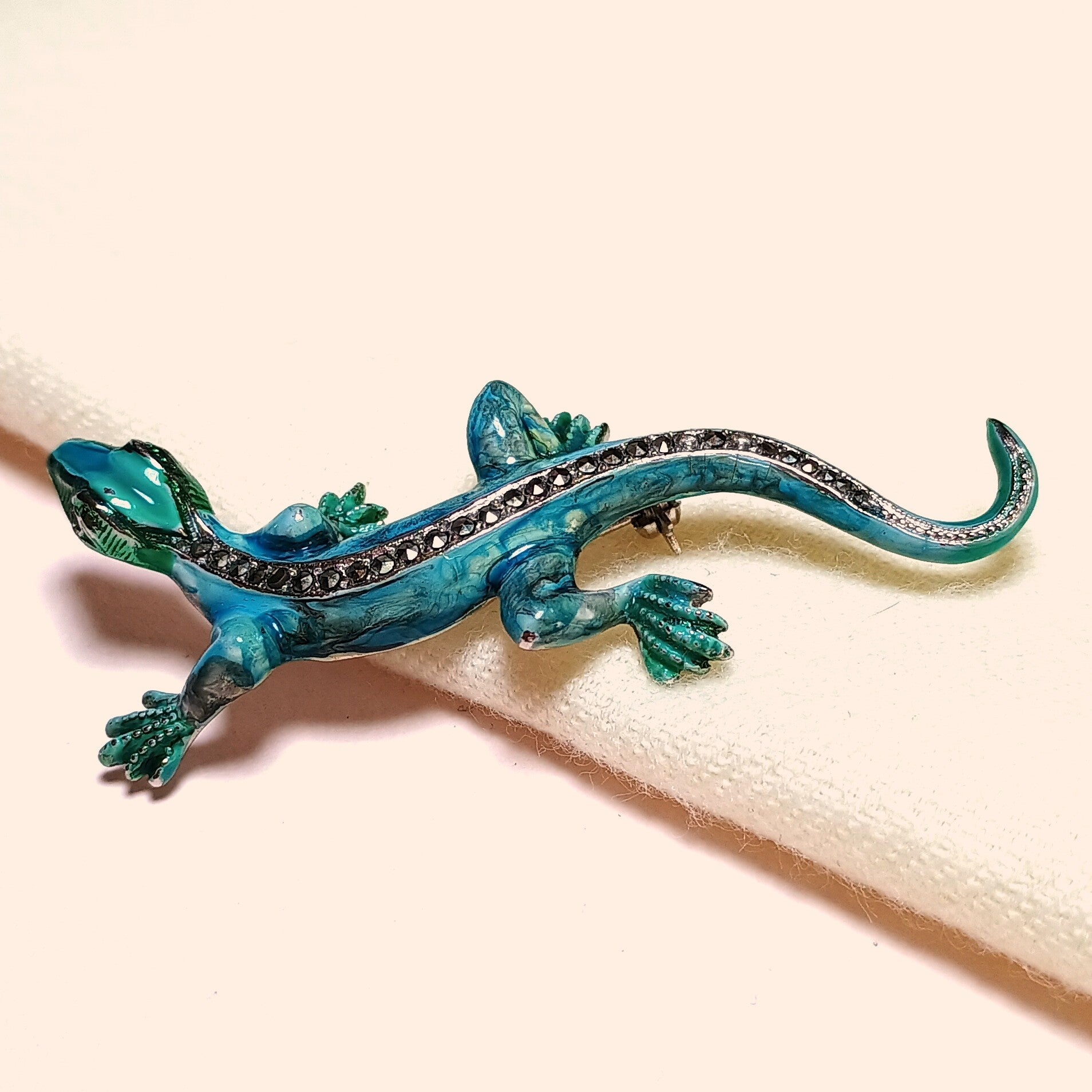 Vintage novelty broche in ontwerp van een geëmailleerde salamander met marcasiet steentjes uit de jaren '60.