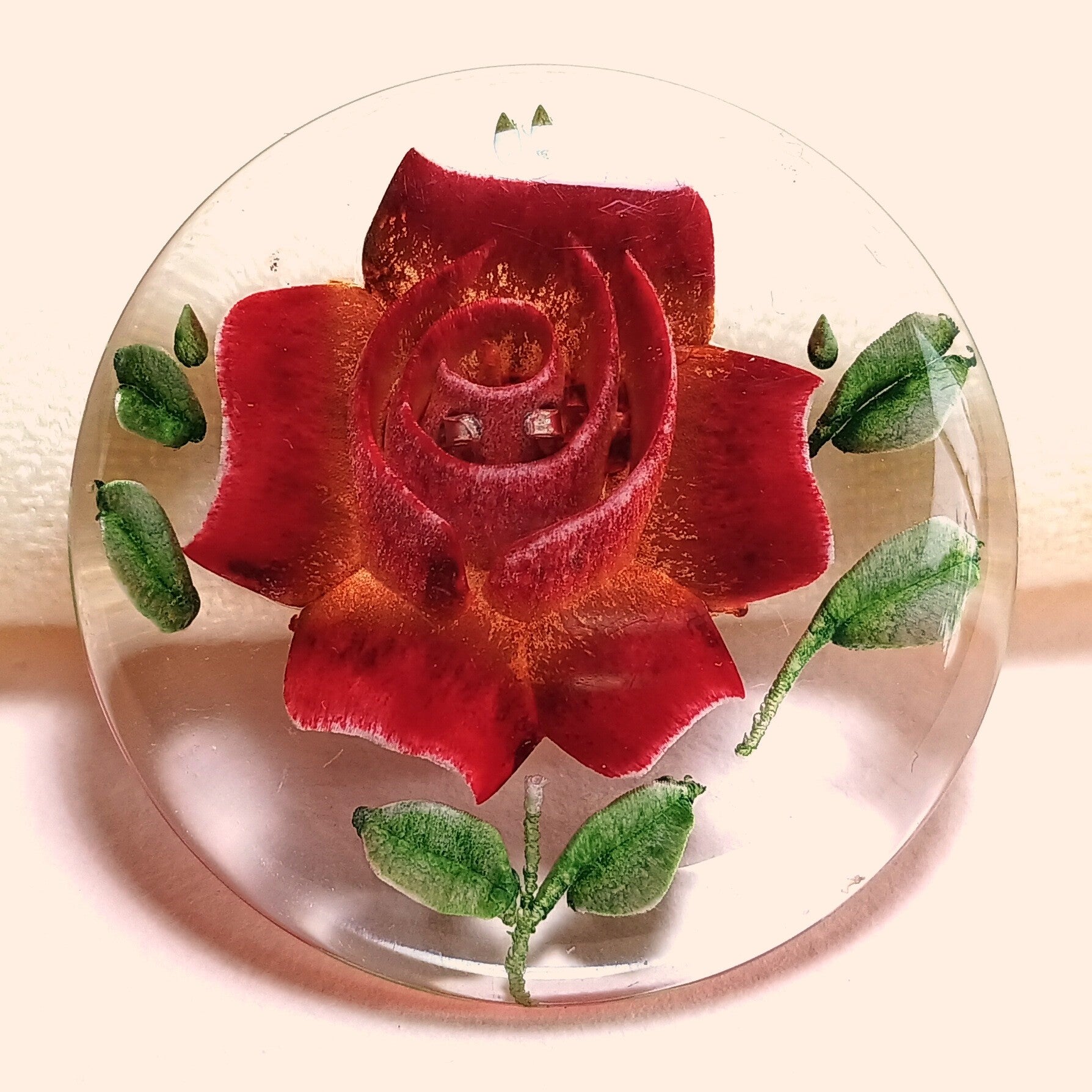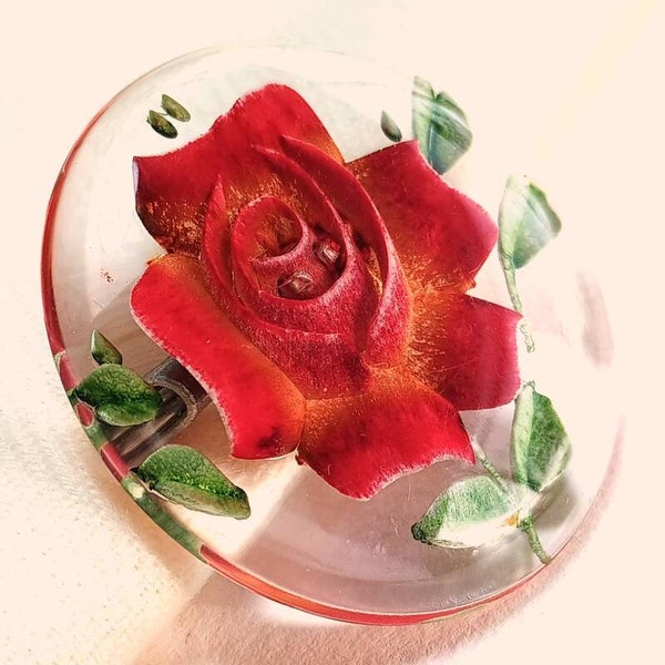 Vintage broche van reversed carved lucite met rode roos uit de jaren '40-'50.