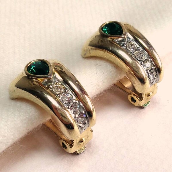 Klassieke vintage oorclips van verguld metaal bezet met smaragdgroene en heldere strass uit de jaren '80.