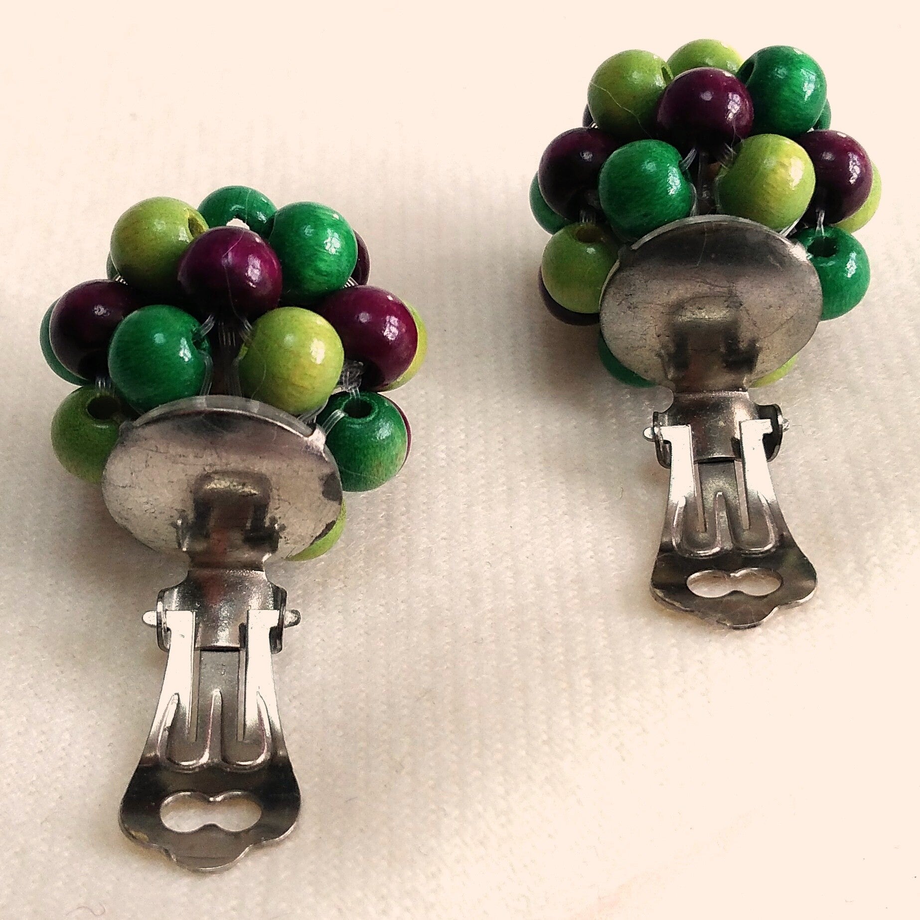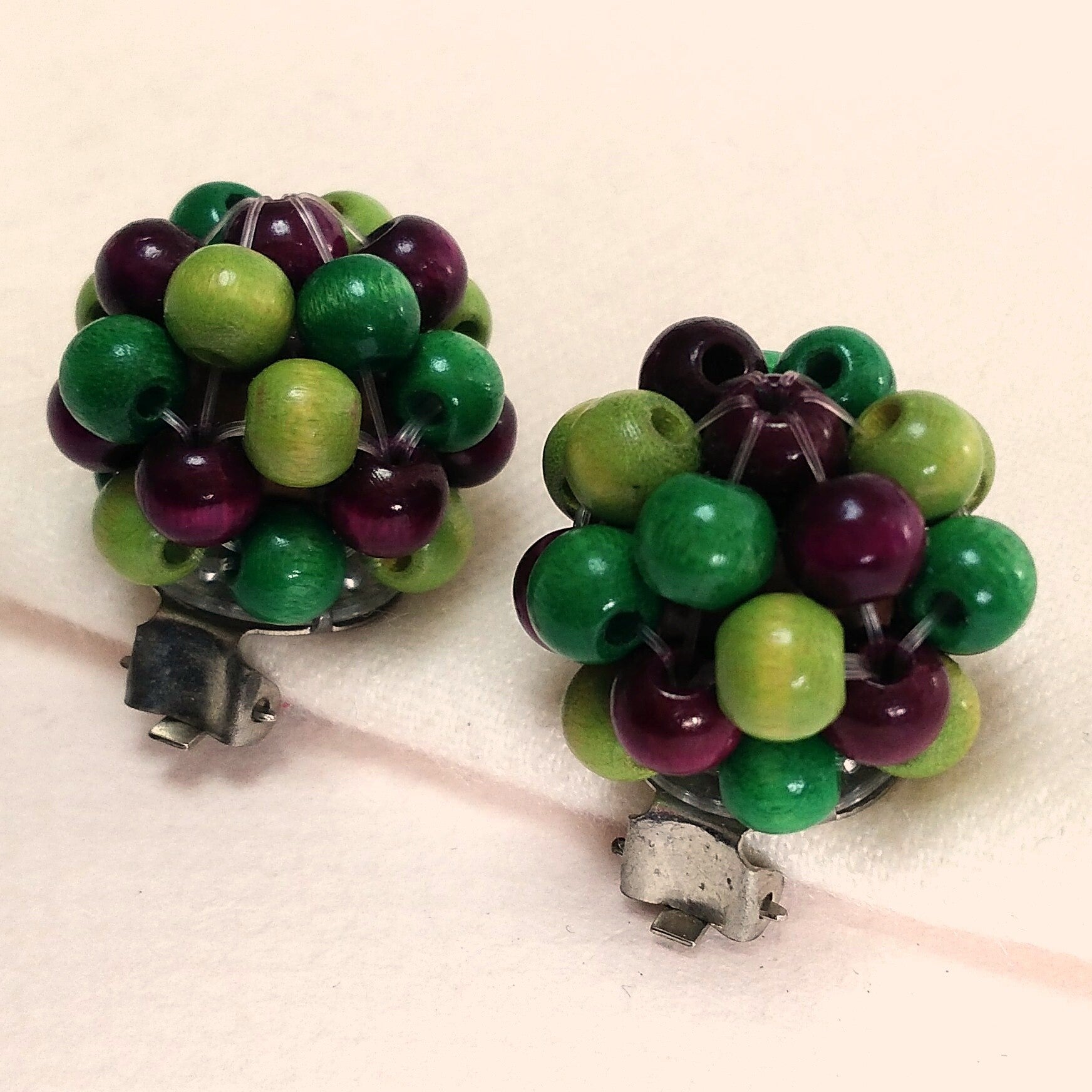 Vintage oorclips met groene en donkermagenta houten kraaltjes uit de jaren '80.