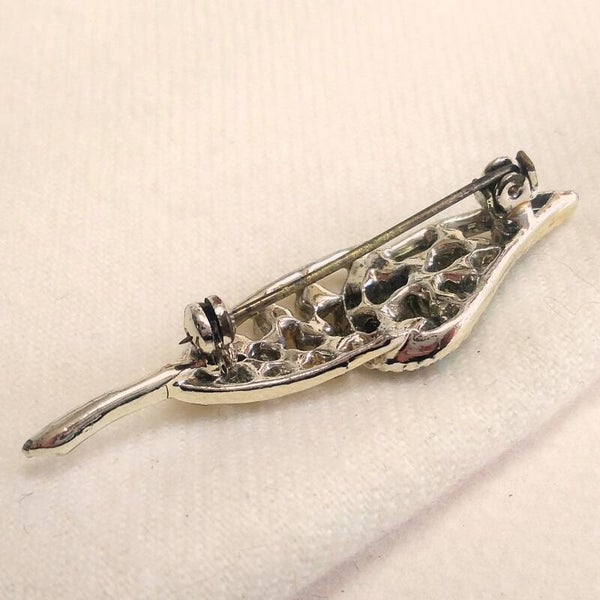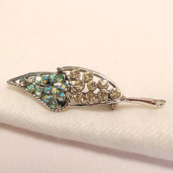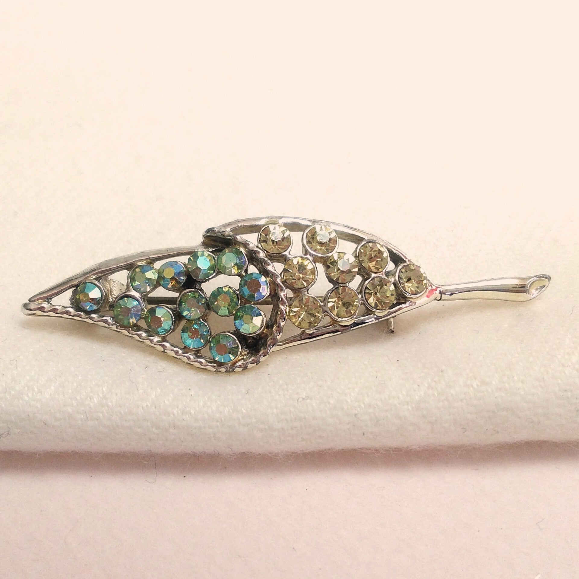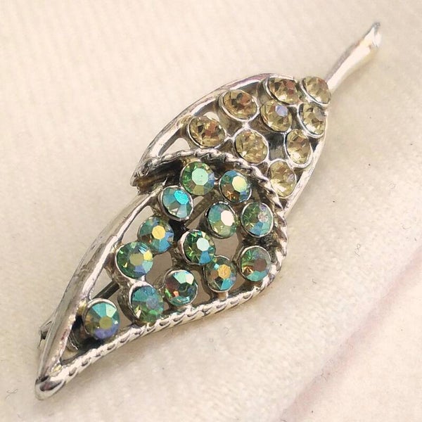 Vintage broche van zilverkleurig metaal in bladontwerp met licht geelgroene en groene AB strass uit de jaren '50-'60.
