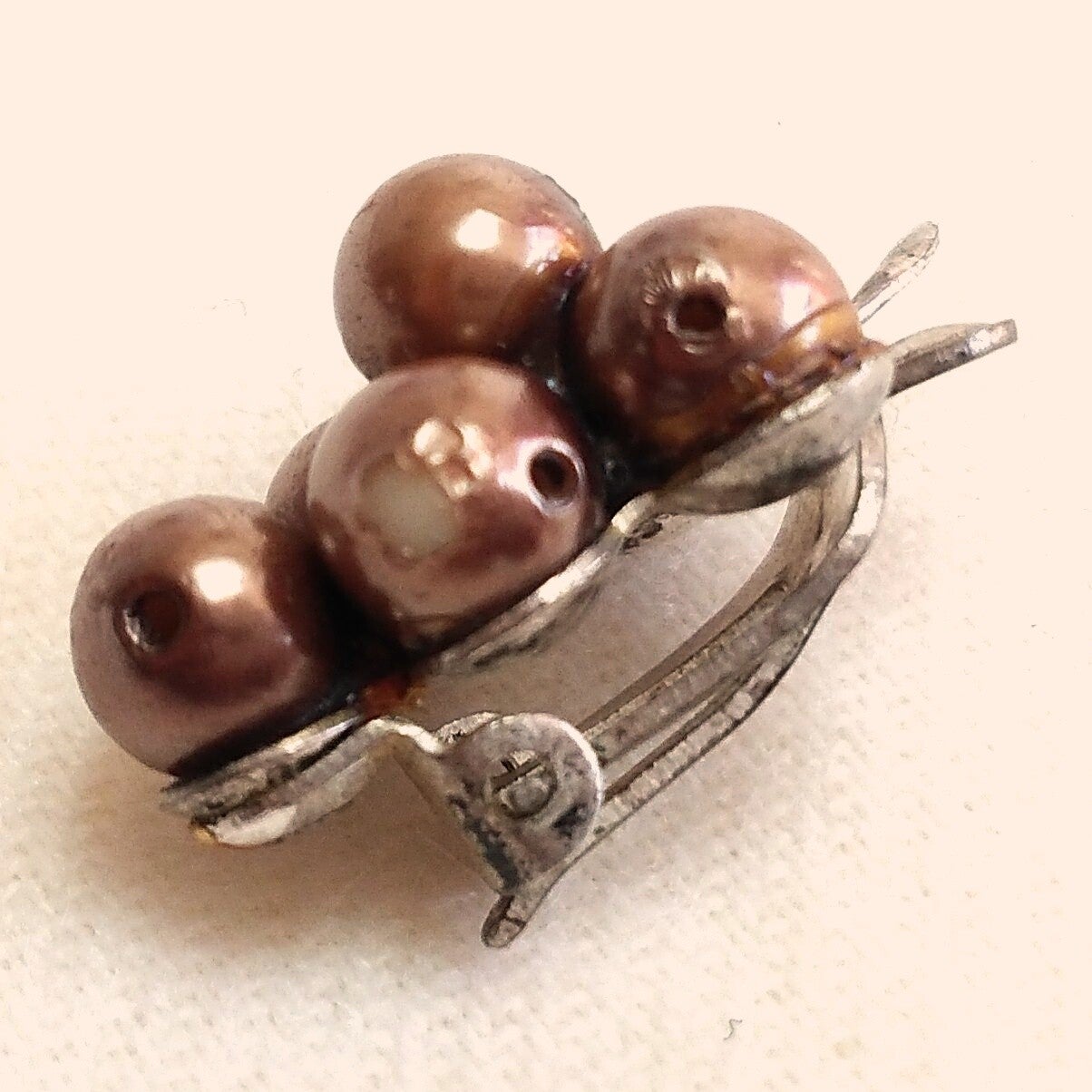 Vintage oorclips in druiventros ontwerp met mokka faux pareltjes uit de jaren '50-'60.