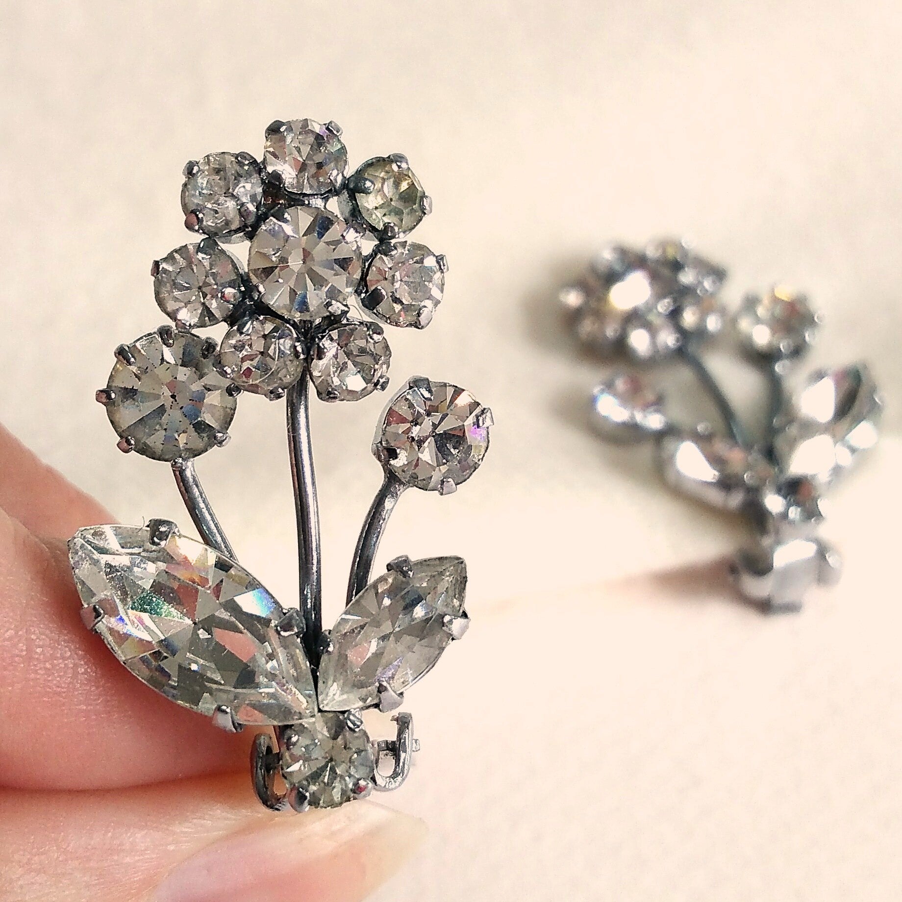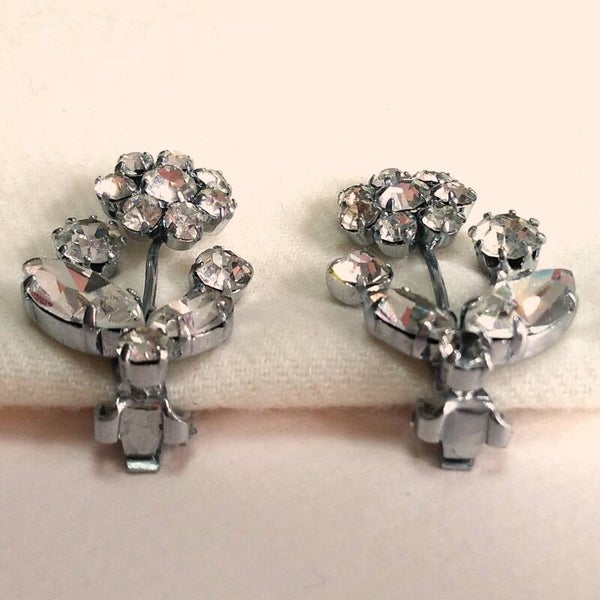 Vintage dress- & shoeclips in ontwerp van bloemen van zilverkleurig metaal bezet met heldere strass uit de jaren '50-'60.