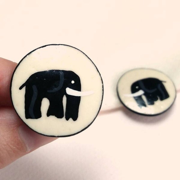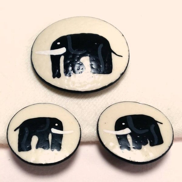 Vintage sieraden set met broche oon oorclips met zwart-grijze olifant op crème achtergrond uit de jaren '80.
