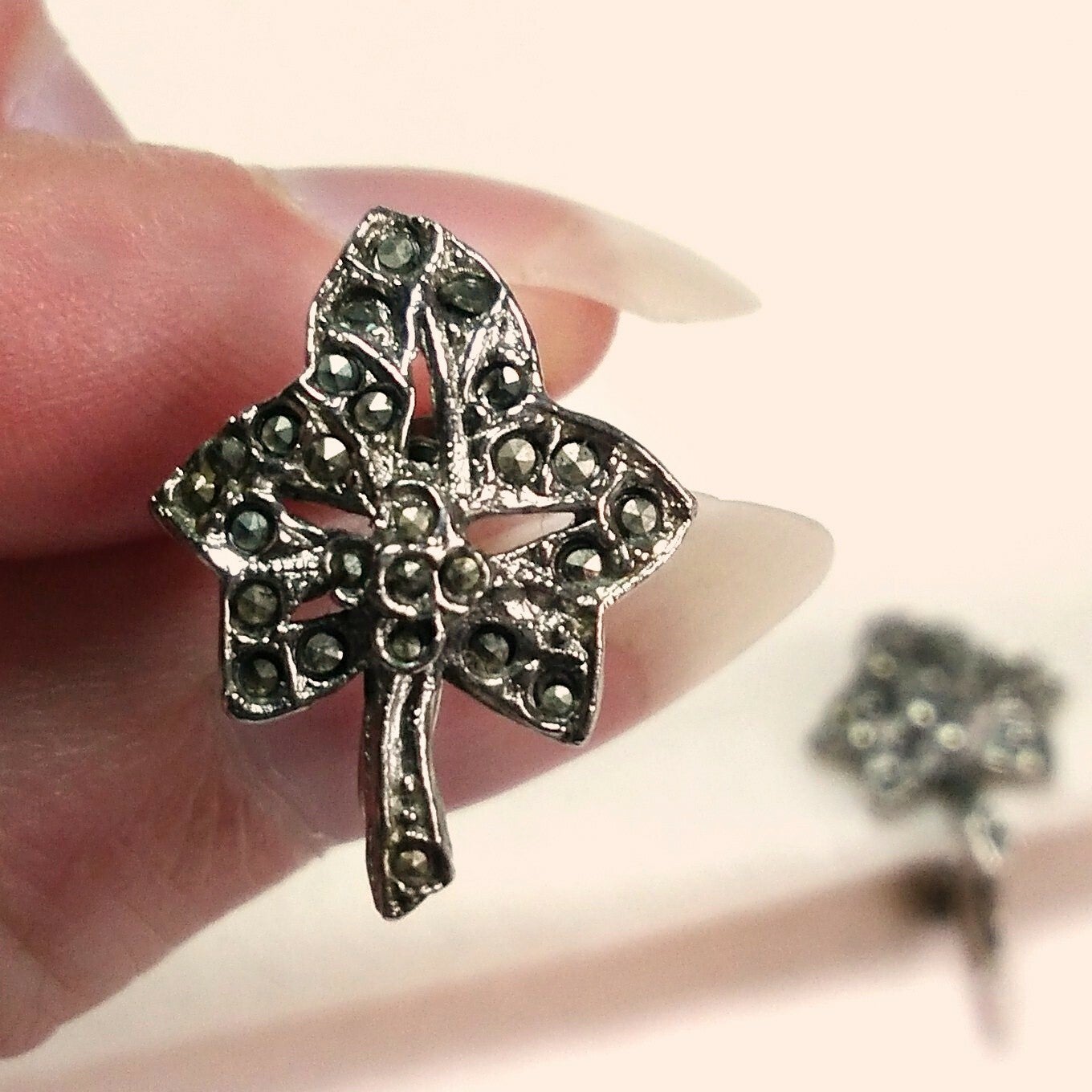 Vintage schroefoorbellen van zilverkleurig metaal bezet met marcasietjes in ontwerp van klimopbladeren uit de jaren '40-'50.