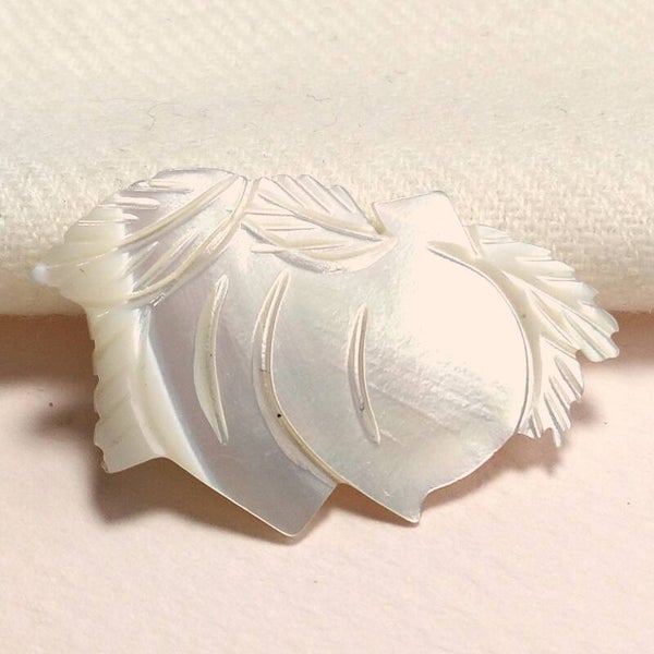 Vintage broche van handgesneden parelmoer in voorstelling van twee perzikken uit de jaren '70-'80.