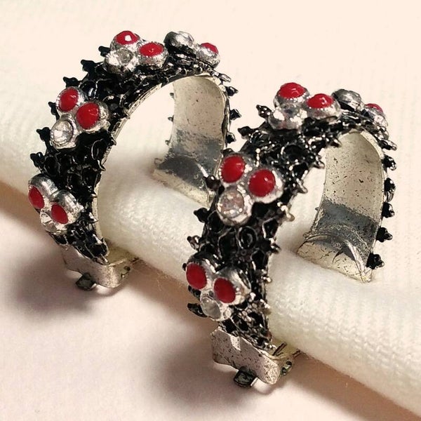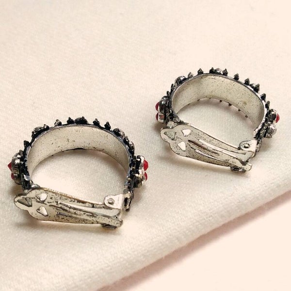 Vintage oorclips van bewerkt metaal met rode opaque en heldere strass uit de jaren '70-'80.